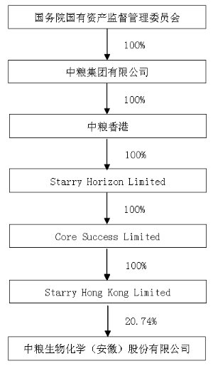 为优化业务结构,提高中粮集团核心竞争力,2011年9月15日,公司控股股东中粮集团有限公司与其境外全资子公司Starry Hong Kong Limited签订了《股份注资协议》,中粮集团拟将其所持有的公司2亿股股份全部注入Starry Hong Kong Limited。2011年9月27日,国务院国有资产监督管理委员会做出《关于中粮生物化学(安徽)股份有限公司国有股东所持股份向境外注资有关问题的批复》(国资产权[2011]1159号),根据该批复,国务院国资委同意上述注资事项,上述《股份注资协议》正式生效。按照《股份注资协议》约定,双方应在协议生效后15个工作日内,根据相关法律办理股份注入的过户手续。