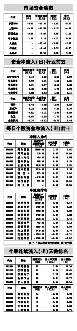 各类资金当日净流量对比 资金策市 Money Flow 大盘在年初创下2132点的低位后,逐步走出阴霾,一批强势股率先走出反弹行情。统计显示,在今年以来24个交易日里,82只个股已出现过两次以上涨停,其中,罗平锌电惊现8次涨停。与之相比,56只个股则长期表现低调,2009年以来的三年多时间里,从未出现过涨停。 今年以来,上证指数涨幅6.93%,深成指和中小板指分别涨幅7.47%与5.07%,创业板指数下跌1.99%。个股表现出较为明显的分化走势,52只涨幅已超过三成,其中包含11只ST板块个股。罗平锌电出现8次涨停,股价翻番;紫鑫药业出现5次涨停,累计涨幅达54.38%;广晟有色、靖远煤电分别有3次和4次涨停,股价涨幅均超过五成。统计发现,采掘、金属、石化等行业在今年的开年行情中领跑。82只今年出现过两次以上涨停的个股中,79只跑赢大盘,仅3只落后于指数,如国海证券虽然在1月9日与2月8日先后两次涨停,但累计涨幅仅为6.73%;恒信移动过山车走势更为明显,尽管今年已出现过3次涨停,但也跌停两次,累计涨幅仅为3.78%,落后于上证指数。 剔除今年上市新股以及ST板块个股,可比的2169只A股中,352只今年以来至少出现过一次涨停,但是,并不意味着其他个股表现全线垫底。据统计,6只今年未涨停的个股累计涨幅超过三成,股价仍有骄人表现。例如,华夏幸福连续收阳,但未达到涨停限制,今年以来累计涨幅达49.6%;通富微电稳步上扬,涨幅达32.21%。 统计还发现,一些个股较长时期内股东没有尝试过涨停的滋味。我们将条件设定为2009年以前上市,符合单日涨幅达10%限定的A股,其中,56只2009年以来均未出现过涨停。这些个股不乏流通盘较大的权重股,如工商银行,近三年多来单日最大涨幅为6.83%,单日最大跌幅为9.97%,累计涨幅40.94%;中国石油,2009年以来单日最大涨幅为7.69%,单日最大跌幅为6.7%,累计涨幅9.37%。 大盘股由于其流通性略差的自身特点,不易暴涨暴跌,值得关注的是,7只中小板个股在三年多的时间里也未出现过涨停。如苏宁电器,单日最大涨幅为9.28%,单日最大跌幅为9.1%,2009年以来累计涨幅14.19%,落后于大盘;报喜鸟单日最大涨幅为9.75%,单日最大跌幅为7.05%,累计涨幅180.59%,显著强于大盘。可见,尽管小盘股活跃度高,流通性强,但也并非屡见涨跌停板。 年报期间,市场对高送转、业绩超预期、并购重组等题材的炒作日益升温。截至昨日,38家已公布年报公司显示,26家发布了年度分红预案,其中,6家10送转10股以上。118只有成交的ST类A股中,38只今年以来涨幅逾两成,*ST昌九、*ST盛润A、ST盛达今年以来涨幅已超过五成。(李千) 据STCN资金流向快报(http://data.stcn.com/statisticalData.shtml)数据显示,2月13日,沪深两市共流出资金12.56亿元,连续第2个交易日净流出。其中,沪市净流出19.53亿元,深市净流入6.98亿元。主力资金合计流出4.30亿元。 指数方面,上证180指数成份股合计资金流出17.95亿元,深证成指成份股资金流出3.04亿元,沪深300指数成份股资金流出23.31亿元。以股本规模计,流通盘中大盘股资金流出17.47亿元,中盘股资金流出6.43亿元,小盘股资金流入11.34亿元。 行业方面,按照衍生申万一级行业分类计,有11个行业资金净流入,14个行业资金净流出。其中,电子元器件流入资金4.49亿,成为资金最关注的行业;银行流出资金8.48亿,有较明显的资金出逃现象。 保险业已持续4个交易日净流入资金,共流入资金5.80亿,居行业连续流入天数榜首位。有色金属业已持续3个交易日净流出资金,共流出资金19.00亿,为行业连续流出天数榜第一。 洋河股份已持续12个交易日净流入资金,累计流入资金1.84亿,居个股连续流入天数榜首位。鼎立股份已持续34个交易日净流出资金,累计流出资金8.58亿,为个股连续流出天数榜第一。 股指期货方面,期指合约均升。IF1202合约收报2531.00点,微涨0.05%;成交36.20万手,持仓量减1845手,收报2.68万手;资金共流入12.22亿。(黄舒欣) (注:加▲公司为2011年年度净利润,专题数据由上海聚源数据服务有限公司提供,数据来源于上市公司公告,若有出入,请以公告为准。) (本栏目数据来源:名策数据) (注:数据基于模型测算,不构成投资建议,仅供投资者参考。更多详情:http://idea.stcn.com) 本版导读: