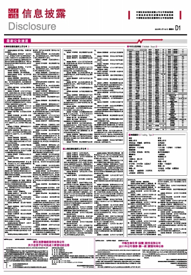 深圳证券交易所上市公司 000018,200018 ST中冠A 股票交易异常波动。 000024,200024 招商地产 2012年2月14日,招商地产全资子公司招商局地产(北京)有限公司与九龙仓集团有限公司全资子公司大连盈致企业管理有限公司联合竞买取得北京市朝阳区来广营乡A4和B4地块的国有建设用地使用权,成交价总计23.7亿元。 000045,200045 深纺织A 子公司收到政府补助资金500万元人民币。 000050 深天马A 股价异动。 000153 丰原药业 重大事项停牌。 000413,200413 宝石A 2011年年度报告披露日期变更。 000415 渤海租赁 股权质押公告。 000429,112009,1182270,200429 粤高速A 2011年度业绩快报:基本每股收益0.17元,净资产收益率5.18%,每股净资产3.27元。 000509 SST华塑 公司独立董事违规买卖公司股票。 000519 江南红箭 3月8日召开2012年第二次临时股东大会,审议关于兵器财务有限责任公司为公司及下属子公司提供金融服务关联交易议案。 000562 宏源证券 2012年2月14-15日,宏源证券通过深交所交易系统以集中竞价交易方式继续减持因在天山水泥公开增发中包销的股份10,371,612股。 000581,200581 威孚高科 3月7日召开2012年第一次临时股东大会,审议关于修改公司章程的提案报告等。 000607 *ST华控 办公地址及联系方式变更。 000627 天茂集团 2012年第一次临时股东大会通过有关议案。 000629,115001 攀钢钒钛 预计2011年归属于上市公司股东的净利润为盈利0万元-20000万元,比上年同期下降87.45%-100%。 000650 仁和药业 董事会通过关于拟设立全资孙公司的议案。 000700 模塑科技 修正后预计2011年归属于上市公司股东的净利润为盈利约7300万元-8900万元,比上年同期增长120%-170%。 000750 国海证券 股份质押。 000783 长江证券 董事会通过了关于公司增设证券营业部的议案、关于公司增设分公司的议案。 000792 盐湖股份 办理资产等权属证书登记工作的进展。 000796 易食股份 3月2日召开1012年第一次临时股东大会,审议关于补选第六届董监事会成员的议案等。 000799 酒鬼酒 证券部办公地址及联系方式变更。 000831 *ST关铝 恢复上市保荐人更名。 000877,041164010,1182347 天山股份 2012年2月14-15日,宏源证券减持公司2.12%的股份,计10,371,612股。 000892 *ST星美 办公地址搬迁。 000895 双汇发展 董事会通过关于更新重大资产重组相关事项的议案、关于修改重大资产重组相关交易协议和盈利预测补偿协议的议案等。 000901 航天科技 国有股权无偿划转的提示。 000917,1082186 电广传媒 董事会通过关于为湖南省有线电视网络(集团)股份有限公司贷款提供担保的议案。 000930,101699,112058,1181202 中粮生化 最终确定公司2011年公司债券(第一期)票面利率为6.80%。 000931 中关村 总裁辞职。 000950 建峰化工 2012年第一次临时股东大会通过有关议案。 000965 天保基建 2011年度业绩快报:基本每股收益0.55元,净资产收益率11.42%,每股净资产5.05元。 000976 春晖股份 重大资产重组的进展。 000977 浪潮信息 控股子公司收到财政拨款1000万元。 002022 科华生物 全自动生化分析仪完成CE认证的提示。 002037 久联发展 被认定为高新技术企业复审通过。 002048 宁波华翔 回购部分社会公众股份的债权人通知。2012年第一次临时股东大会通过有关议案。 002052,1181198 同洲电子 全资子公司变更名称及经营范围。 002054 德美化工 3月5日召开2012年第一次临时股东大会,审议公司关于绿元农牧建设“草本酶生态养殖项目”的议案等。 002092,112044,1182029,1182073 中泰化学 发行2012年度第二期非公开定向债务融资工具。 002104 恒宝股份 2011年度业绩快报:基本每股收益0.26元,净资产收益率17.28%,每股净资产1.60元。 002115 三维通信 完成注册资本工商变更登记。 002122 天马股份 通过高新技术企业复审。 002128 露天煤业 2011年度业绩快报:基本每股收益1.08元,净资产收益率35.18%,每股净资产3.46元。 002131 利欧股份 大连华能已在大连市工商行政管理局完成股权变更的工商登记手续,并领取了新的《企业法人营业执照》,大连华能正式成为公司的全资子公司。 002132,041164013 恒星科技 通过高新技术企业复审。 002136 安 纳 达 2011年度业绩快报:基本每股收益0.27元,净资产收益率10.32%,每股净资产2.96元。 002157 正邦科技 董事会通过关于变更部分非公开发行股票募集资金投资项目实施地点的议案等。 002162 斯米克 通过高新技术企业复审。 002184 海得控制 通过高新技术企业复审。 002191 劲嘉股份 董事会通过关于公司继续使用部分闲置募集资金补充流动资金的议案等议案。 002194 武汉凡谷 2011年度业绩快报:基本每股收益0.2892元,净资产收益率7.83%,每股净资产3.7357元。 002197 证通电子 3月5日召开2012年第一次临时股东大会,审议关于增加经营范围并修改公司章程的议案等。 002199 东晶电子 股票交易异常波动。 002200 *ST大地 可能暂停上市的风险提示。控股股东协议转让限售股份过户登记完成及股东承诺过户后继续锁定。 002214 大立科技 涉及筹划资产重组的进展。 002229 鸿博股份 2011年年度报告主要财务指标:基本每股收益0.4011元,净资产收益率9.28%,每股净资产5.12元。每10股派2.65元转增9股。3月9日召开2011年年度股东大会,审议《2011年年度报告》及其摘要等。 002233 塔牌集团 董事会通过《关于公司全资子公司广东塔牌混凝土投资有限公司投资兴建混凝土搅拌站的议案》、《关于龙门分公司横坑矿区扩大生产规模并缴纳采矿权价款