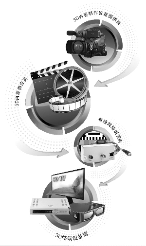 每天首播4.5小时,每天重播两次——央视3D频道,这个自今年元旦正式开播、由央视牵头、5家地方电视台联合制作的新兴频道已运行1个半月。对于大多数观众,它还是陌生而神秘的,但是隐现其后的3D产业链商机,已被上下游众多商家洞察。 根据广电总局的“十二五”规划要求,中国将在“十二五”期间开播10个3D电视频道,而与此同时,大荧幕上的3D影片也越来越多。面对滚滚而来的3D热潮,电视厂商、广电网络运营商、影视内容制作者、其他辅助设备制造商,有的冲锋在前,有的摇旗呐喊,有的沉心布局,有的平淡面对。各怀心思的背后,凸显产业链各端受益预期的差别。 3D摄像机: 三星、松下、索尼等 3D后期制作: 捷成股份、Quantel等 影视制作公司: 华谊兄弟、中视传媒、 中南卡通等 有线电视运营商: 歌华有线、天威视讯、广电网络等 电视厂商: 海信、TCL、 康佳、长虹等 高清机顶盒: 同洲电子、银河、四川九洲等 3D眼镜:歌尔声学等 本版导读: