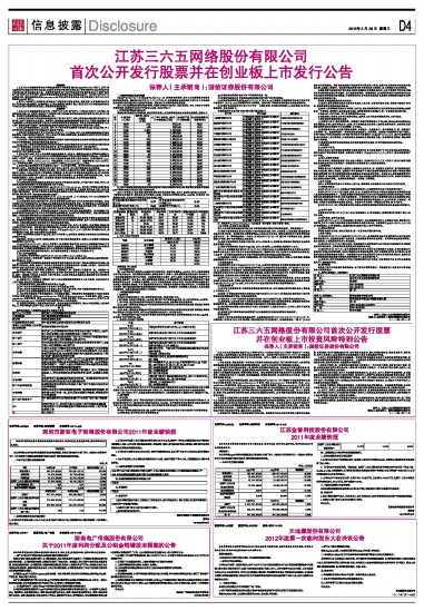 江苏三六五网络股份有限公司首次公开发行股票并在创业板上市投资风险特别公告保荐人(主承销商):国信证券股份有限公司 2012-02-29 来源:证券时报网 作者: