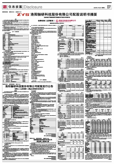 保荐机构(主承销商):国金证券股份有限公司 配股说明书公告时间:2012年2月29日 声明 本公司全体董事、监事、高级管理人员承诺配股说明书及其摘要不存在任何虚假、误导性陈述或重大遗漏,并保证所披露信息的真实、准确、完整。 公司负责人、主管会计工作负责人及会计机构负责人(会计主管人员)保证配股说明书及其摘要中财务会计报告真实、完整。 证券监督管理机构及其他政府部门对本次发行所作的任何决定,均不表明其对发行人所发行证券的价值或者投资人的收益作出实质性判断或者保证。任何与之相反的声明均属虚假不实陈述。 根据《证券法》的规定,证券依法发行后,发行人经营与收益的变化,由发行人自行负责,由此变化引致的投资风险,由投资者自行负责。 本募集说明书摘要的目的仅为向公众提供有关本次发行的简要情况。投资者在做出认购决定之前,应仔细阅读募集说明书全文,并以其作为投资决定的依据。募集说明书全文同时刊载于深圳证券交易所网站。 第一节 本次发行概况 一、本次发行的基本情况 (一)发行人基本情况 ■ (二)本次发行的基本情况 1、本次发行核准情况:本次配股方案经公司第四届董事会第二次会议审议通过,并经2011年第一次临时股东大会表决通过。 本次发行已经中国证券监督管理委员会证监许可[2012]110号文核准。 2、配售股票类型:人民币普通股(A股)。 3、每股面值:人民币1.00元。 4、发行数量:本次配售以刊登配股说明书及发行公告前一交易日总股本108,090,000股为基数,以每10股配售3股的比例向全体股东配售,可配售股份总数为32,427,000股。 5、发行价格:本次配股价格为12.50元/股。 6、预计募集资金量(含发行费用):不超过40,533.75万元人民币。 7、预计募集资金净额:不超过37,919.04万元人民币。 8、募集资金专项存储账户: ■ 9、发行方式:网上定价发行,通过深交所交易系统进行。 10、发行对象:本次配股股权登记日2012年3月2日在中国证券登记结算有限公司深圳分公司登记在册的公司全体股东。 11、承销方式:代销。 12、承销期:2012年2月29日至2012年3月13日。 13、发行费用:本次发行费用包括保荐及承销费用、律师费用、注册会计师费用等费用,合计约人民币2,614万元。 14、发行日程安排:股权登记日为2012年3月2日(T日),本次配股的发行计划安排如下: 本次配股发行期间的主要日程和停牌安排如下: ■ 注:上述日期为交易日。如遇重大突发事件影响本次发行,公司将及时公告,调整发行日程。 15、申请上市的证券交易所:深圳证券交易所。 16、本次发行股份的上市流通:本次发行结束后,公司将尽快向深圳证券交易所申请本次发行股份的上市流通,具体上市时间将另行公告。 (三)控股股东关于全额参与配股的承诺 公司控股股东中国机械工业集团有限公司出具了《关于认购洛阳轴研科技股份有限公司2011年度配股股份的承诺函》:将按轴研科技确定的认购条件及持有轴研科技股份比例以现金全额认购本次配股方案中的可配股份。 二、本次发行的有关机构 (一)发行人 名称:洛阳轴研科技股份有限公司 法定代表人:吴宗彦 办公地址:河南省洛阳市吉林路1号 联系人:俞玮、赵祥功 电话:0379—64881139 传真:0379—64881518 (二)保荐机构(主承销商) 名称:国金证券股份有限公司 法定代表人:冉云 注册地址:成都市东城根上街95号 办公地址:上海市浦东新区芳甸路1088号紫竹国际大厦23楼 保荐代表人:尹志勇、常厚顺 项目协办人:刘涛涛 项目组成员:余庆生、邢耀华、丁魁、王舜 电话:021-68826002 传真:021-68826800 (三)发行人律师事务所 名称:北京市汉鼎联合律师事务所 负责人:储备 办公地址:北京市西三环北路87号国际财经中心D座606室 经办律师:罗剑烨、胡育 电话:010-68981288 传真:010-68981388 (四)审计机构 名称:北京兴华会计师事务所有限责任公司 法定代表人:王全洲 办公地点:北京市西城区裕民路18号2211房间 注册会计师:王伟 李金玲 电话:010-82250666 传真:010-82250851 (五)申请上市的证券交易所 名称:深圳证券交易所 办公地址:广东省深圳市深南东路5045号 电话:0755-82083333 传真:0755-82083275 (六)收款银行 名称:中国建设银行成都市新华支行 账户名称:国金证券股份有限公司 账号:51001870836050605761 (七)股票登记机构 名称:中国证券登记结算有限公司深圳分公司 办公地址:深圳市深南中路1093号中信大厦18楼 法定代表人:陈耀先 电话:0755-25938000 传真:0755-25988122 第二节 主要股东情况 一、公司股本结构 截至2011年6月30日,公司总股本为108,090,000股,具体股本结构如下: ■ 二、前十名股东持股情况 截至2011年6月30日,公司前十名股东持股情况如下: ■ 第三节 财务会计信息 公司2008年度、2009年度和2010年度财务报告均已经北京兴华会计师事务所有限责任公司审计,审计意见类型全部为标准无保留意见。公司于2011年10月24日发布了其未经审计的2011年三季度报告,具体信息内容可在深圳证券交易所网站、巨潮资讯网站查询。 一、最近三年及一期的财务报表 (一)最近三年及一期资产负债表(合并) 单位:元 ■ (二)最近三年及一期利润表(合并) 单位:元 ■ (三)最近三年及一期现金流量表(合并) 单位:元 ■ (四)最近三年及一期资产负债表(母公司) 单位:元 ■ (五)最近三年及一期利润表(母公司) 单位:元 ■ (六)最近三年及一期现金流量表(母公司) 单位:元 ■ 二、公司