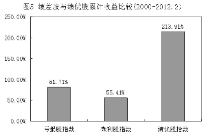 图4 亏损公司市净率比较(2011年) ■ 资料来源:汤姆森路透、万得数据 投资者热衷于炒绩差ST股的主要原因之一是期望公司重组,“乌鸡变凤凰”。但在市场上,绩差公司经过重组脱胎换骨的毕竟少之又少,而且重组过程中经历长时间停牌,重组方案充满不确定性。对绩差公司的热炒,往往沦为对个股题材的炒作、“博傻”行为,甚至内幕交易。在市场环境不好时,没有业绩支撑的绩差股票大幅下跌,大部分高位买入投资者,损失惨重。整体上看,买入绩差股的收益远不如绩优蓝筹股。如图5所示,2000年至今,亏损股指数、微利股指数累计收益分别为81.71%、55.41%,而绩优股指数同期收益为213.91%。从个股来看,ST股波动极大。以ST昌九为例,在借壳预期下,公司股价从2011年6月的8元左右涨至2011年11月的15元多,涨幅近90%,但公司2011年12月复牌后18天内,由于重组不确定性以及大盘回调,经历了16个跌停板,直线跌至6元左右,给投资者带来巨幅损失。投资者对绩差公司的炒作有制度方面的原因,但本质上是投资者,特别是中小投资者一夜暴富的心态和不正确的投资理念所致。