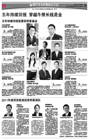 希望成为 长期领跑者 鹏华基金固定收益部不断向前的原动力是为投资人创造回报。在此我谨代表我们的团队,向广大投资者和社会各界给予的关注与支持表示真挚的感谢。 债券投资如同一场拉力赛,耐力和稳定性才是真正的考验。虽然短期争锋者的荣耀让人心动,但我们更希望成为长期中的领跑者。 从长期看中国经济必将走向转型,但当下正处于抉择艰难的矛盾时期,政策调控和市场波动或更加剧烈和难以预判。针对这种实际情况,我们会进一步贯彻稳健投资思路,追求中长期的确定收益。 鹏华基金固定收益部是一个稳定且经验丰富的投研团队,基于集体智慧的投资也许没有市场浪尖弄潮儿那般潇洒飘逸,但集体力量和稳健风格使我们更适合成为一艘航行在波浪中的大船,“理性投资、主动操作、控制风险、稳健增值”依然是整个团队前进的航标。 鹏华基金成立于1998年12月,截至2011年底,旗下基金数量达27只,资产管理规模近498亿元。鹏华基金在固定收益资产上具备着丰富的管理经验,目前旗下共管理6只债券型基金与1只货币市场基金,在业内形成了良好的口碑。2011年,在股债市场低迷的情况下,鹏华旗下固定收益类产品均取得了正收益,其优异的固定收益投资能力得到充分体现。鉴于此,公司荣获得2011年度固定收益投资明星团队奖。 2011年,鹏华丰收债券以4.32%的收益率,在77只二级债基中拔得头筹。 提供精细化 投资理财方案 荣获“2011年度固定收益投资明星团队奖”,对嘉实固定收益团队既是认可,也是勉励。 嘉实固定收益团队秉承兢兢业业、稳中求进的精神,经过八年团队锤炼,以严格的风险控制,严谨的规范流程,涵盖宏观、债券、 信用、可转债等多领域研究。 我们肩负着投资人的信任,致力于帮助投资人把握确定性收益。针对不同的理财需求,我们提供精细化的解决方案:嘉实货币和嘉实安心货币提供现金管理工具;嘉实超短债基金作为业内唯一的短期纯债基金,追求高流动性下的稳妥收益;嘉实债券和嘉实信用债适合追求稳定增值的投资者,嘉实多利债券和嘉实多元债券帮助投资者追求低风险下的收益最大化。收益水平高低不是绝对的,而是要视乎投资者的收益预期以及风险承受能力。投资者首先要根据自己的实际情况、风险偏好及投资目标确定总资产中的资产配置比例和投资类别。 嘉实基金成立于1999年3月,是老十家基金公司之一。截至2011年底,嘉实旗下基金数量达31只,资产管理规模近1375亿元。嘉实固定收益团队是嘉实基金旗下的一只明星投资团队,目前管理6只债券型基金与2只货币市场基金。截至2011年底,固定收益资产管理规模近300亿元,位列行业前茅,投资业绩亦表现出色。鉴于此,公司荣获得2011年度固定收益投资明星团队奖。 嘉实超短债2011年的收益率达3.56%,位列同类可比基金第一。 追求稳健的 长期绝对回报 感谢主办方将“2011年度固定收益投资明星团队奖”授予华安基金,感谢各位评委对于华安基金固定收益团队投资能力的认可。 业绩固然重要,更重要的是取得的方法和可持续性。我们的固定收益投资团队秉承研究驱动的价值投资理念,采用自上而下配置大类资产、自下而上挖掘个券相对价值的方法,注重债券的票息收益,追求稳健的长期绝对回报。 作为国内首批进军固定收益产品领域的基金公司,华安基金在固定收益系统和团队建设方面做了许多基础工作。华安基金不仅是业内建立最早内部评级体系的公司之一,也是业内最早建立固定收益交易系统和投资分析系统的公司之一,同时还是业内较早建立完善的固定收益业绩归因系统的公司之一。 受益于上述良好的系统构建和具有丰富经验的投资团队,华安基金的固定收益产品取得了不错的长期回报。 华安基金成立于1998年6月,是国内首批基金管理公司之一。截至2011年底,华安旗下基金数量达24只,资产管理规模近782.73亿元(不包括联接基金),其中固定收益团队共管理5只债券型基金与1只货币市场基金,资产管理规模近223亿元。2011年,股债市场整体低迷,华安基金旗下的固定收益类产品却表现良好。鉴于此,公司荣获得2011年度固定收益投资明星团队奖。 华安稳固收益去年净值增长率4.40%,在73只一级债基中排名第二。 本版基金点评:上海证券基金评价研究中心、晨星资讯 朱景峰/制表 吴比较/制图 本版导读: