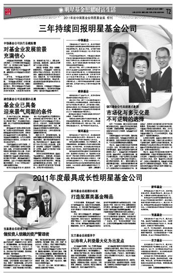 宝盈基金总经理汪钦 做投资人信赖的资产管理者 证券时报授予宝盈“2011年度明星基金公司成长奖”,深感荣幸与不安!荣幸在于,奖项意味着媒体、客户和市场对宝盈基金过去一年工作的认可;不安在于,在2011年糟糕的市场状况下,我们也未能幸免,没有为客户资产实现增值。获此殊荣,深知期望、责任和使命! 2011年是宝盈基金成立的第十个年头,我们以崭新的姿态迎接市场的考验和投资人的检阅,公司在投研销一体化方面做了不少尝试,取得了一些经验和成绩。去年公司的投资业绩挺进行业前1/4,在没有新基金发行的背景下,实现了管理份额10%的增长。同时,我们尝试推行事业部制,提高管理效率,效果明显;我们强调“进取、共享、和谐”的企业文化,共同努力,形成了难得的平稳局面。一句话,我们在努力,我们也在进步! 2012年也许是中国基金业可以喘口气的年份,赚钱是大概率事件。我们会牢记使命,尽最大努力为持有人创造财富;继续坚持投研销一体化,把业务基础打得更牢些;我们将做好内控治理和流程管理,把风险死角进一步清理掉;我们将坚持“进取、共享、和谐”的企业文化,铺垫好企业长期发展的基石。 受人之托,忠人之事!我们将不懈努力,做投资人信赖的资产管理者。 新华基金总经理孙枝来 打造股票类基金精品 三年两次获得“明星基金奖”殊荣,对于新华基金而言,是莫大的肯定和鼓舞。借此机会,向一直以来给予新华基金信任、支持与厚爱的广大投资者表示衷心的感谢和问候。 作为一家中小型基金公司,新华基金早在2009年初就根据当时的竞争格局和自身的相对优势,将自己定位为“做优秀的权益类资产管理人”,专注于偏股型基金的投资管理。三年来,新华基金的投资能力实现了跨越式发展。2011年,新华基金成为银河证券当年平均股票投资主动管理收益亚军;在海通证券3年期(2009-2011年间)股票投资收益排行榜中,新华基金排名第一。业绩的取得更加坚定了新华基金打造股票类基金精品,为广大投资者创造可持续的价值回报的目标和信心。 “沉舟侧畔千帆过,病树前头万木春”,2012年市场形势依旧复杂多变,但投资价值已经显现。新华基金仍将以“持有人利益第一”为宗旨,坚守“专注权益类投资”的定位,以我们的股票基金精品为投资者创造最稳定的回报。 东方基金总经理单宇 以持有人利益最大化为出发点 东方基金此次获得“2011年度明星基金公司成长奖”,是持有人对我们的支持和理解,我们深感责任重大,我们将继续努力。 做好客户资产管理工作,我们认为既要考虑客户的短期利益需求,又要注重客户的长期利益目标。这要求我们要不断提高公司持续经营能力,不断提升投研服务水平,不断加强风险控制,不断做好客户服务,信念坚定,不畏困难,多想办法,长期坚持。我们认为做好这些基础工作,是东方基金的价值所在。 东方基金能在激烈的市场竞争中挺过来,并逐渐为市场所接受,得益于持有人的支持,得益于围绕持有人利益为核心的发展理念,无论是公司战略、产品设计、投研管理都以持有人利益最优化为出发点,这让东方基金获益匪浅。 基金业目前可能遇到发展中的一些困难,但只要我们坚持,相信倡导长期投资、价值投资、注重持有人利益保护的基金行业一定会迎来美好发展的未来。 新华基金 宝盈基金东方基金 新华基金成立于2004年12月,是西部地区设立的第一家基金管理公司。截至2011年底,已管理两个品种的公募基金产品共7只。 新华基金作为业绩带动规模的典型代表,在2011年市场环境不佳的背景下,成为少数几家逆市实现净申购的公司之一。截至2011年底,新华基金管理公墓基金资产总规模逾64.36亿元。3只股票型基金在同类基金中的收益率均居前8%。