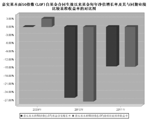 基金管理人:嘉实基金管理有限公司 基金托管人:中国工商银行股份有限公司 送出日期:2012年3月30日 §1 重要提示 基金管理人的董事会、董事保证本报告所载资料不存在虚假记载、误导性陈述或重大遗漏,并对其内容的真实性、准确性和完整性承担个别及连带的法律责任。本年度报告已经全部独立董事签字同意,并由董事长签发。 基金托管人中国工商银行股份有限公司根据本基金合同规定,于2012年3月22日复核了本报告中的财务指标、净值表现、利润分配情况、财务会计报告、投资组合报告等内容,保证复核内容不存在虚假记载、误导性陈述或者重大遗漏。 基金管理人承诺以诚实信用、勤勉尽责的原则管理和运用基金资产,但不保证基金一定盈利。 基金的过往业绩并不代表其未来表现。投资有风险,投资者在作出投资决策前应仔细阅读本基金的招募说明书及其更新。 本报告期自2011年1月1日起至2011年12月31日止。 本年度报告摘要摘自年度报告正文,投资者欲了解详细内容,应阅读年度报告正文。 §2 基金简介 2.1 基金基本情况 ■ 2.2 基金产品说明 ■ 2.3 基金管理人和基金托管人 ■ 2.4 信息披露方式 ■ §3 主要财务指标、基金净值表现及利润分配情况 3.1 主要会计数据和财务指标 金额单位:人民币元 ■ 注:(1)本期已实现收益指基金本期利息收入、投资收益、其他收入(不含公允价值变动收益)扣除相关费用后的余额,本期利润为本期已实现收益加上本期公允价值变动收益;(2)所述基金业绩指标不包括持有人认购或交易基金的各项费用,计入费用后实际收益水平要低于所列数字;(3)期末可供分配利润采用期末资产负债表中未分配利润与未分配利润中已实现部分的孰低数。 3.2 基金净值表现 3.2.1 基金份额净值增长率及其与同期业绩比较基准收益率的比较 ■ 注:本基金业绩比较基准为:中证锐联基本面 50 指数收益率×95%+银行同业存款收益率×5%。 中证锐联基本面50指数以基本面指标来衡量上市公司的经济规模,选取其中最大的50家A股上市公司作为样本,且样本个股的权重配置与其经济规模相适应。该指数综合反映了中国证券市场基本面良好企业的整体状况,适合作为本基金的标的指数。 本基金的业绩基准指数按照构建公式每交易日进行计算,计算方式如下: Benchmark(0)=1000 Return(t) =95%×(中证锐联基本面50指数(t)/中证锐联基本面50指数(t-1)-1)+5%×银行同业存款每日收益率 Benchmark(t)=(1+Return (t))×Benchmark (t-1) 其中t=1,2,3,…。 3.2.2 自基金合同生效以来基金份额累计净值增长率变动及其与同期业绩比较基准收益率变动的比较 ■ 图:嘉实基本面50指数(LOF)基金份额累计净值增长率与同期业绩比较基准收益率的 历史走势对比图(2009年12月30日至2011年12月31日) 注:按基金合同和招募说明书的约定,本基金自基金合同生效日起6个月内为建仓期,建仓期结束时本基金的各项投资比例符合基金合同(十一(三)投资范围和(七)2、基金投资组合限制)的有关约定。 3.2.3 自基金合同生效以来基金每年净值增长率及其与同期业绩比较基准收益率的比较 ■ 注:本基金基金合同生效日为2009年12月30日,2009年度的相关数据根据当年实际存续期(2009年12月30日至2009年12月31日)计算。 3.3 过去三年基金的利润分配情况 本基金自基金合同生效以来未实施利润分配。 §4 管理人报告 4.1 基金管理人及基金经理情况 4.1.1 基金管理人及其管理基金的经验 本基金管理人为嘉实基金管理有限公司,成立于1999年3月25日,是经中国证监会批准设立的第一批基金管理公司之一,是中外合资基金管理公司。公司注册地在上海,总部设在北京并设深圳、成都、杭州、青岛、南京、福州、广州分公司。公司获得首批全国社保基金、企业年金投资管理人和QDII、特定资产管理业务资格。 截止2011年12月31日,基金管理人共管理2只封闭式证券投资基金、29只开放式证券投资基金,具体包括嘉实泰和封闭、嘉实丰和价值封闭、嘉实成长收益混合、嘉实增长混合、嘉实稳健混合、嘉实债券、嘉实服务增值行业混合、嘉实优质企业股票、嘉实货币、嘉实沪深300指数(LOF)、嘉实超短债债券、嘉实主题混合、嘉实策略混合、嘉实海外中国股票(QDII)、嘉实研究精选股票、嘉实多元债券、嘉实量化阿尔法股票、嘉实回报混合、嘉实基本面50指数(LOF)、嘉实价值优势股票、嘉实稳固收益债券、嘉实H股指数(QDII-LOF)、嘉实主题新动力股票、嘉实多利分级债券、嘉实领先成长股票、嘉实深证基本面120ETF、嘉实深证基本面120ETF联接、嘉实黄金(QDII-FOF-LOF)、嘉实信用债券、嘉实周期优选股票、嘉实安心货币。其中嘉实增长混合、嘉实稳健混合、嘉实债券属于嘉实理财通系列基金,同时,管理多个全国社保基金、企业年金、特定客户资产投资组合。 4.1.2 基金经理(或基金经理小组)及基金经理助理简介 ■ 注:(1)任职日期是指本基金合同生效之日;(2)证券从业的含义遵从行业协会《证券业从业人员资格管理办法》的相关规定。 4.2 管理人对报告期内本基金运作遵规守信情况的说明 报告期内,本基金管理人严格遵循了《证券法》、《证券投资基金法》及其各项配套法规、《嘉实中证锐联基本面50指数证券投资基金(LOF)基金合同》和其他相关法律法规的规定,本着诚实信用、勤勉尽责的原则管理和运用基金资产,在严格控制风险的基础上,为基金份额