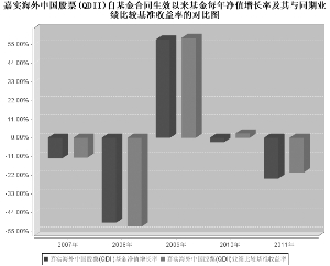 基金管理人:嘉实基金管理有限公司 基金托管人:中国银行股份有限公司 送出日期:2012年3月30日 §1 重要提示 基金管理人的董事会、董事保证本报告所载资料不存在虚假记载、误导性陈述或重大遗漏,并对其内容的真实性、准确性和完整性承担个别及连带的法律责任。本年度报告已经全部独立董事签字同意,并由董事长签发。 基金托管人中国银行股份有限公司根据本基金合同规定,于2012年3月22日复核了本报告中的财务指标、净值表现、利润分配情况、财务会计报告、投资组合报告等内容,保证复核内容不存在虚假记载、误导性陈述或者重大遗漏。 基金管理人承诺以诚实信用、勤勉尽责的原则管理和运用基金资产,但不保证基金一定盈利。 基金的过往业绩并不代表其未来表现。投资有风险,投资者在作出投资决策前应仔细阅读本基金的招募说明书及其更新。 本报告期自2011年1月1日起至2011年12月31日止。 本年度报告摘要摘自年度报告正文,投资者欲了解详细内容,应阅读年度报告正文。 §2 基金简介 2.1 基金基本情况 ■ 2.2 基金产品说明 ■ 2.3 基金管理人和基金托管人 ■ 2.4 境外资产托管人 ■ 2.5 信息披露方式 ■ §3 主要财务指标、基金净值表现及利润分配情况 3.1 主要会计数据和财务指标 金额单位:人民币元 ■ 注:(1)本期已实现收益指基金本期利息收入、投资收益、其他收入(不含公允价值变动收益)扣除相关费用后的余额,本期利润为本期已实现收益加上本期公允价值变动收益;(2)所述基金业绩指标不包括持有人认购或交易基金的各项费用,计入费用后实际收益水平要低于所列数字;(3)期末可供分配利润采用期末资产负债表中未分配利润与未分配利润中已实现部分的孰低数。 3.2 基金净值表现 3.2.1 基金份额净值增长率及其与同期业绩比较基准收益率的比较 ■ 3.2.2 自基金合同生效以来基金份额累计净值增长率变动及其与同期业绩比较基准收益率变动的比较 ■ 图:嘉实海外中国股票(QDII)基金份额累计净值增长率与同期业绩比较基准收益率的 历史走势对比图(2007年10月12日至2011年12月31日) 注1:按基金合同约定,本基金自基金合同生效日起6个月内为建仓期。建仓期结束时本基金各项资产配置比例符合基金合同第十四条((九)投资限制)的规定:(1)持有同一家银行的存款不得超过本基金净值的20%,在托管账户的存款可以不受上述限制;(2)持有同一机构(政府、国际金融组织除外)发行的证券市值不得超过基金净值的10%;(3)本公司管理的全部基金不得持有同一机构10%以上具有投票权的证券发行总量,指数基金可以不受上述限制;(4)持有非流动性资产市值不得超过基金净值的10%;(5)相对于基金资产净值,股票投资比例为60-100%。 注2:2011年9月21日,本基金管理人发布《关于嘉实海外中国股票(QDII)基金经理变更的公告》,江隆隆先生不再担任本基金基金经理,聘请钟山先生担任本基金基金经理职务。 3.2.3 自基金合同生效以来基金每年净值增长率及其与同期业绩比较基准收益率的比较 ■ 注:本基金基金合同生效日为2007年10月12日,2007年度的相关数据根据当年实际存续期(2007年10月12日至2007年12月31日)计算。 3.3 过去三年基金的利润分配情况 过去三年本基金未实施利润分配。 §4 管理人报告 4.1 基金管理人及基金经理情况 4.1.1 基金管理人及其管理基金的经验 本基金管理人为嘉实基金管理有限公司,成立于1999年3月25日,是经中国证监会批准设立的第一批基金管理公司之一,是中外合资基金管理公司。公司注册地在上海,总部设在北京并设深圳、成都、杭州、青岛、南京、福州、广州分公司。公司获得首批全国社保基金、企业年金投资管理人和QDII、特定资产管理业务资格。 截止2011年12月31日,基金管理人共管理2只封闭式证券投资基金、29只开放式证券投资基金,具体包括嘉实泰和封闭、嘉实丰和价值封闭、嘉实成长收益混合、嘉实增长混合、嘉实稳健混合、嘉实债券、嘉实服务增值行业混合、嘉实优质企业股票、嘉实货币、嘉实沪深300指数(LOF)、嘉实超短债债券、嘉实主题混合、嘉实策略混合、嘉实海外中国股票(QDII)、嘉实研究精选股票、嘉实多元债券、嘉实量化阿尔法股票、嘉实回报混合、嘉实基本面50指数(LOF)、嘉实价值优势股票、嘉实稳固收益债券、嘉实H股指数(QDII-LOF)、嘉实主题新动力股票、嘉实多利分级债券、嘉实领先成长股票、嘉实深证基本面120ETF、嘉实深证基本面120ETF联接、嘉实黄金(QDII-FOF-LOF)、嘉实信用债券、嘉实周期优选股票、嘉实安心货币。其中嘉实增长混合、嘉实稳健混合、嘉实债券属于嘉实理财通系列基金,同时,管理多个全国社保基金、企业年金、特定客户资产投资组合。 4.1.2 基金经理(或基金经理小组)及基金经理助理简介 ■ 注:(1)任职日期、离任日期是指公司作出决定后公告之日;(2)证券从业的含义遵从行业协会《证券业从业人员资格管理办法》的相关规定。 4.2 管理人对报告期内本基金运作遵规守信情况的说明 在报告期内,本基金管理人严格遵循了《证券法》、《证券投资基金法》及其各项配套法规、《嘉实海外中国股票股票型证券投资基金基金合同》和其他相关法律法规的规定,本着诚实信用、勤勉尽责的原则管理和运用基金资产,在严格控制风险的基础上,为基金份额持有人谋求最大利益。本基金运作管理符合有