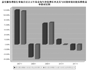 基金管理人:嘉实基金管理有限公司 基金托管人:中国银行股份有限公司 送出日期:2012年3月30日 §1 重要提示 基金管理人的董事会、董事保证本报告所载资料不存在虚假记载、误导性陈述或重大遗漏,并对其内容的真实性、准确性和完整性承担个别及连带的法律责任。本年度报告已经全部独立董事签字同意,并由董事长签发。 基金托管人中国银行股份有限公司根据本基金合同规定,于2012年3月22日复核了本报告中的财务指标、净值表现、利润分配情况、财务会计报告、投资组合报告等内容,保证复核内容不存在虚假记载、误导性陈述或者重大遗漏。 基金管理人承诺以诚实信用、勤勉尽责的原则管理和运用基金资产,但不保证基金一定盈利。 基金的过往业绩并不代表其未来表现。投资有风险,投资者在作出投资决策前应仔细阅读本基金的招募说明书及其更新。 本报告期自2011年1月1日起至2011年12月31日止。 本年度报告摘要摘自年度报告正文,投资者欲了解详细内容,应阅读年度报告正文。 §2 基金简介 2.1 基金基本情况 ■ 2.2 基金产品说明 ■ 2.3 基金管理人和基金托管人 ■ 2.4 信息披露方式 ■ §3 主要财务指标、基金净值表现及利润分配情况 3.1 主要会计数据和财务指标 金额单位:人民币元 ■ 注:(1)本期已实现收益指基金本期利息收入、投资收益、其他收入(不含公允价值变动收益)扣除相关费用后的余额,本期利润为本期已实现收益加上本期公允价值变动收益;(2)所述基金业绩指标不包括持有人认购或交易基金的各项费用,计入费用后实际收益水平要低于所列数字;(3)期末可供分配利润采用期末资产负债表中未分配利润与未分配利润中已实现部分的孰低数。 3.2 基金净值表现 3.2.1 基金份额净值增长率及其与同期业绩比较基准收益率的比较 ■ 注:本基金业绩比较基准为:中信综合指数×80%+中信国债指数×20%。 本基金的业绩基准指数按照构建公式每交易日进行计算,计算方式如下: Benchmark(0)=1000 Return(t)=80%×(中信综合指数(t)/中信综合指数(t-1) -1)+20%×(中信国债指数 (t)/中信国债指数 (t-1) -1) Benchmark(t)=(1+Return (t))×Benchmark (t-1) 其中t=1,2,3,…。 3.2.2 自基金合同生效以来基金份额累计净值增长率变动及其与同期业绩比较基准收益率变动的比较 ■ 图:嘉实服务增值行业混合份额累计净值增长率与同期业绩比较基准收益率的历史走势对比图 (2004年4月1日至2011年12月31日) 注:按基金合同规定,本基金自基金合同生效日起6个月内为建仓期。建仓结束时本基金的各项投资比例符合基金合同第十八条((二)投资范围和(六)投资组合比例限制)的约定:(1)在正常市场情况下,本基金资产配置的比例范围:股票资产25%-95%;债券资产0%-70%;现金或到期日在一年以内的政府债券不低于基金资产净值的5%。其中,基金投资于服务业股票的比例不低于基金股票资产的80%。(2)持有一家公司的股票,不得超过基金资产净值的10%。(3)本基金与由本基金管理人管理的其他基金持有一家公司发行的证券,不得超过该证券的10%。(4)法律法规规定的其他限制。 3.2.3 过去五年基金每年净值增长率及其与同期业绩比较基准收益率的比较 ■ 3.3 过去三年基金的利润分配情况 单位:人民币元 ■ §4 管理人报告 4.1 基金管理人及基金经理情况 4.1.1 基金管理人及其管理基金的经验 本基金管理人为嘉实基金管理有限公司,成立于1999年3月25日,是经中国证监会批准设立的第一批基金管理公司之一,是中外合资基金管理公司。公司注册地在上海,总部设在北京并设深圳、成都、杭州、青岛、南京、福州、广州分公司。公司获得首批全国社保基金、企业年金投资管理人和QDII、特定资产管理业务资格。 截止2011年12月31日,基金管理人共管理2只封闭式证券投资基金、29只开放式证券投资基金,具体包括嘉实泰和封闭、嘉实丰和价值封闭、嘉实成长收益混合、嘉实增长混合、嘉实稳健混合、嘉实债券、嘉实服务增值行业混合、嘉实优质企业股票、嘉实货币、嘉实沪深300指数(LOF)、嘉实超短债债券、嘉实主题混合、嘉实策略混合、嘉实海外中国股票(QDII)、嘉实研究精选股票、嘉实多元债券、嘉实量化阿尔法股票、嘉实回报混合、嘉实基本面50指数(LOF)、嘉实价值优势股票、嘉实稳固收益债券、嘉实H股指数(QDII-LOF)、嘉实主题新动力股票、嘉实多利分级债券、嘉实领先成长股票、嘉实深证基本面120ETF、嘉实深证基本面120ETF联接、嘉实黄金(QDII-FOF-LOF)、嘉实信用债券、嘉实周期优选股票、嘉实安心货币。其中嘉实增长混合、嘉实稳健混合、嘉实债券属于嘉实理财通系列基金,同时,管理多个全国社保基金、企业年金、特定客户资产投资组合。 4.1.2 基金经理(或基金经理小组)及基金经理助理简介 ■ 注:(1)任职日期、离任日期是指公司作出决定后公告之日;(2)证券从业的含义遵从行业协会《证券业从业人员资格管理办法》的相关规定。 4.2 管理人对报告期内本基金运作遵规守信情况的说明 报告期内,本基金管理人严格遵循了《证券法》、《证券投资基金法》及其各项配套法规、《嘉实服务增值行业证券投资基金基金合同》和其他相关法律法规的规定,本着诚实信用、勤勉尽责的原则管理和运用基金资产,在严格控制风险的基础上,为基金份额持有人谋求最大利益。本基金运作管理符合有关法律法规和基金合同的规定和