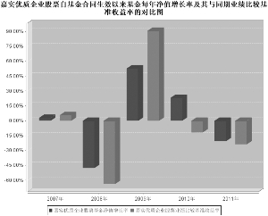 基金管理人:嘉实基金管理有限公司 基金托管人:上海浦东发展银行股份有限公司 送出日期:2012年3月30日 §1 重要提示 基金管理人的董事会、董事保证本报告所载资料不存在虚假记载、误导性陈述或重大遗漏,并对其内容的真实性、准确性和完整性承担个别及连带的法律责任。本年度报告已经全部独立董事签字同意,并由董事长签发。 基金托管人上海浦东发展银行股份有限公司根据本基金合同规定,于2012年3月22日复核了本报告中的财务指标、净值表现、利润分配情况、财务会计报告、投资组合报告等内容,保证复核内容不存在虚假记载、误导性陈述或者重大遗漏。 基金管理人承诺以诚实信用、勤勉尽责的原则管理和运用基金资产,但不保证基金一定盈利。 基金的过往业绩并不代表其未来表现。投资有风险,投资者在作出投资决策前应仔细阅读本基金的招募说明书及其更新。 本报告期自2011年1月1日起至2011年12月31日止。 本年度报告摘要摘自年度报告正文,投资者欲了解详细内容,应阅读年度报告正文。 §2 基金简介 2.1 基金基本情况 ■ 2.2 基金产品说明 ■ 2.3 基金管理人和基金托管人 ■ 2.4 信息披露方式 ■ §3 主要财务指标、基金净值表现及利润分配情况 3.1 主要会计数据和财务指标 金额单位:人民币元 ■ 注:(1)本期已实现收益指基金本期利息收入、投资收益、其他收入(不含公允价值变动收益)扣除相关费用后的余额,本期利润为本期已实现收益加上本期公允价值变动收益;(2)所述基金业绩指标不包括持有人认购或交易基金的各项费用,计入费用后实际收益水平要低于所列数字;(3)期末可供分配利润采用期末资产负债表中未分配利润与未分配利润中已实现部分的孰低数。 3.2 基金净值表现 3.2.1 基金份额净值增长率及其与同期业绩比较基准收益率的比较 ■ 注:本基金业绩比较基准为:沪深300 指数×95% +上证国债指数×5%。 本基金的业绩基准指数按照构建公式每交易日进行计算,计算方式如下: Benchmark(0)=1000 Return(t)=95%×(沪深300指数 (t)/沪深300指数(t-1)-1)+5%×(上证国债指数(t)/上证国债指数(t-1)-1) Benchmark(t)=(1+Return (t))×Benchmark(t-1) 其中t=1,2,3,…。 3.2.2 自基金合同生效以来基金份额累计净值增长率变动及其与同期业绩比较基准收益率变动的比较 ■ 图:嘉实优质企业股票累计份额净值增长率与同期业绩比较基准收益率的历史走势对比图 (2007年12月8日至2011年12月31日) 注1:本基金由嘉实浦安保本混合型开放式证券投资基金转型而成,自2007年12月8日(含当日)起,本基金基金合同生效,嘉实浦安保本基金基金合同失效。 注2:按基金合同约定,本基金自基金合同生效日起3个月内为建仓期。建仓期结束时本基金的各项投资比例符合基金合同第十八条((二)投资范围和(八)投资组合比例限制)的规定:(1)本基金持有一家上市公司的股票,不得超过基金资产净值的10%;(2)本基金与由本基金管理人管理的其他基金共同持有一家公司发行的证券,不得超过该证券的10%;(3)基金财产参与股票发行申购,本基金所申报的金额不得超过本基金的总资产,所申报的股票数量不得超过拟发行股票公司本次发行股票的总量;(4)《基金法》及其他有关法律法规或监管部门对上述比例限制另有规定的,从其规定。 3.2.3 自基金合同生效以来基金每年净值增长率及其与同期业绩比较基准收益率的比较 ■ 注:本基金基金合同生效日为2007年12月8日,2007年度的相关数据根据当年实际存续期(2007年12月8日至2007年12月31日)计算。 3.3 过去三年基金的利润分配情况 过去三年本基金未实施利润分配。 §4 管理人报告 4.1 基金管理人及基金经理情况 4.1.1 基金管理人及其管理基金的经验 本基金管理人为嘉实基金管理有限公司,成立于1999年3月25日,是经中国证监会批准设立的第一批基金管理公司之一,是中外合资基金管理公司。公司注册地在上海,总部设在北京并设深圳、成都、杭州、青岛、南京、福州、广州分公司。公司获得首批全国社保基金、企业年金投资管理人和QDII、特定资产管理业务资格。 截止2011年12月31日,基金管理人共管理2只封闭式证券投资基金、29只开放式证券投资基金,具体包括嘉实泰和封闭、嘉实丰和价值封闭、嘉实成长收益混合、嘉实增长混合、嘉实稳健混合、嘉实债券、嘉实服务增值行业混合、嘉实优质企业股票、嘉实货币、嘉实沪深300指数(LOF)、嘉实超短债债券、嘉实主题混合、嘉实策略混合、嘉实海外中国股票(QDII)、嘉实研究精选股票、嘉实多元债券、嘉实量化阿尔法股票、嘉实回报混合、嘉实基本面50指数(LOF)、嘉实价值优势股票、嘉实稳固收益债券、嘉实H股指数(QDII-LOF)、嘉实主题新动力股票、嘉实多利分级债券、嘉实领先成长股票、嘉实深证基本面120ETF、嘉实深证基本面120ETF联接、嘉实黄金(QDII-FOF-LOF)、嘉实信用债券、嘉实周期优选股票、嘉实安心货币。其中嘉实增长混合、嘉实稳健混合、嘉实债券属于嘉实理财通系列基金,同时,管理多个全国社保基金、企业年金、特定客户资产投资组合。 4.1.2 基金经理(或基金经理小组)及基金经理助理简介 ■ 注:(1)任职日期是本基金合同生效之日;(2)证券从业的含义遵从行业协会《证券业从业人员资格管理办法》的相关规定。 4.2 管理人对报告期内本基金运作遵规守信情况的说明 报告期内,本基金管理人严格遵循了《证券法