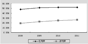 资料来源:公司年报 3、随着公司业务规模扩大以及出货量的增加,2011年毛利率和净利润率保持高位,并呈逐年上升趋势。2008-2011年毛利率分别为47.71%、51.45%、52.06%和52.08%,净利润率分别为19.16%、22.49%、24.52%和26.15%,这说明公司产品的附加值逐年增长,公司具有较强的议价能力。 图2:公司近年毛利率与净利率 资料来源:公司年报,怀新投资 重视自主研发 “哑铃型”模式有助于长期发展 公司经营模式呈现出“研究开发和营销服务两头大、生产管理中间小”的“哑铃型”特点,公司注重整体解决方案的设计、核心模块/软件系统的研发以及客户持续开发、服务与维护,而在生产环节则充分利用社会化专业分工,对外采购或外协加工,公司主要进行软件嵌入、组装调试等核心环节。这种经营模式使得公司利用有限的资源占领了产业链中的高附加值领域,增加了公司产品的竞争力和市场开拓力度,有利于公司长期发展。 管理费用较上年度增加29.03%,主要是本年公司继续加大研发投入,优化人力资源结构,构筑人才优势,积极引进人才,人员工资支出增加及上市费用计入当期损益所致。 图3:公司历年费用率情况 资料来源:公司年报,怀新投资 2011年公司发生研发费用934.34万元,占营业收入的5.08%,比去年同期增长了28.87%。截至上年末,公司研发人员共249人,较年初增加98人,研发人员占员工总数的比例为28.72%。目前公司拥有26项国家专利、69项软件著作权。2011年公司在研、预研项目陆续达成成果,其中,RFID技术紧随物联网发展的步伐,F104、E404型RFID高频和超高频终端的研发已经完成,F104通过了无线电发射设备型号核准证;公司的移动支付商务平台的主要功能模块已经应用在支持金融IC卡的城市一卡通多行业应用平台、手机一卡通省级运营平台、企业手机一卡通系统(电信版)、基于手机支付的会籍管理系统等产品中,并已投入运行。根据公司的研发规划,2012年在研项目储备丰富,如:平安数字校车系统项目、2.4G有源RFID系统硬件开发项目、手机一卡通水控解决方案、能源监控管理系统等项目都将完成研发进入推广应用阶段。 依托RFID技术深厚积累 进入物联网应用广阔蓝海 随着物联网产业的发展,RFID及智能卡技术应用越来越广泛,以及中国电信、中国移动、中国联通三大电信运营商和中国银联近期手机近场支付业务的纷纷推出,以手机为载体的智能一卡通系统需求和建设将成为行业的热点,三大运营商和中国银联通过与国内一卡通解决方案提供商的合作,以搭建区域运营平台和行业应用为导向快速推广手机一卡通并提供电信增值服务(SP)等方式来实现其应用范围遍及学校、企业、城市等领域。电信运营商联手智能一卡通企业共同打造一体化运营平台是未来手机一卡通业务发展的必然趋势。双方的合作共赢关系将使智能一卡通企业开始进入蓝海业务,其市场前景十分广阔。近来年新开普的RFID技术屡获奖项,研发紧随物联网发展的步伐。2011年公司在广东清远城市一卡通项目中成功应用了基于银联标准的金融IC卡,并已在广东韶关、湖南金融IC卡公共服务业运营服务平台及张家界公交卡系统中推广;公司基于电信运营商手机支付标准的城市一卡通业务正在多个省市快速推进。2011年公司与三大运营商共签订了总额为7,854万元的一卡通建设合同,已为762家用户提供了智能一卡通产品。 根据统计数据,我国2010年物联网市场规模接近2000亿元,预计至2015年,中国物联网整体市场规模将达到7500亿元,年复合增长率超过30%,市场前景远远超过计算机、互联网和移动通信等行业。RFID是物联网感知层的主要应用技术,而射频智能卡是RFID标签适合人群使用的典型表现形式,因此智能一卡通企业拥有了进入物联网领域的天然先发优势。而像新开普这样具备丰富行业经验、技术领先优势和已有大量用户积累的行业解决方案提供商将受益于物联网这一新兴产业的快速推进,并获得广阔的市场空间。 (深圳市怀新企业投资顾问有限公司)(CIS) 本版导读: