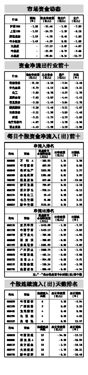 据STCN资金流向快报(http://data.stcn.com/statisticalData.shtml)数据显示,3月29日,沪深两市共流出资金98.18亿元,连续第9个交易日净流出。其中,沪市净流出52.65亿元,深市净流出45.53亿元。主力资金合计流出25.47亿元。 指数方面,上证180指数成份股合计资金流出24.73亿元,深证成指成份股资金流出4.76亿元,沪深300指数成份股资金流出31.46亿元。以股本规模计,流通盘中大盘股资金流出17.15亿元,中盘股资金流出21.93亿元,小盘股资金流出59.04亿元。 行业方面,按照衍生申万一级行业分类计,资金流量方面,有25个行业资金净流出。其中机械设备流出资金11.10亿,有较明显的资金出逃现象。 信息服务业已持续14个交易日净流出资金,共流出资金94.89亿,为行业连续流出天数榜第一。 中信国安已持续6个交易日净流入资金,累计流入资金3.18亿,居个股连续流入天数榜首位。中国联通已持续25个交易日净流出资金,累计流出资金34.30亿,为个股连续流出天数榜第一。 股指期货方面,IF1204合约收报2464.00点,下跌1.23%;成交31.87万手,持仓量减3132手,收报5.45万手;资金共流出14.35亿。(黄舒欣) (本栏目数据来源:名策数据) 本版导读: