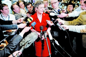 欧元区财长昨日在丹麦首都哥本哈根召开会议,同意将欧元区救助资金规模扩大到8000亿欧元(约合1万亿美元)。各国财长同意将现有欧洲金融稳定工具(EFSF)已经开展的救助项目与今年7月启动的欧元区永久性救助工具——欧洲稳定机制(ESM)叠加。欧洲稳定机制拥有5000亿欧元放贷能力,加上欧洲金融稳定工具已经向希腊、爱尔兰和葡萄牙提供的救助贷款,欧洲救助资金池将达到8000亿欧元。图为丹麦经济与内政大臣韦斯塔格接受媒体采访。(吴家明)IC/供图 本版导读: