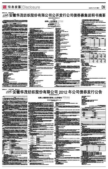 股票代码:000850 股票简称:华茂股份 安徽华茂纺织股份有限公司公开发行公司债券募集说明书摘要(注册地址:安徽省安庆市纺织南路80号) 2012-04-10 来源:证券时报网 作者: