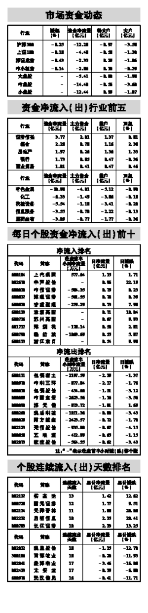 各类资金当日净流量对比 资金策市 Money Flow 38家公司三年收入利润增长提速 (专题数据由上海聚源数据服务有限公司提供,数据来源于上市公司公告,若有出入,请以公告为准) 主力合约期货行情 前20名会员持买单量和卖单量合计 年报披露即将步入尾声,七成公司业绩亮相。整体而言,营业收入与净利润增幅分别为21.27%和12.45%,并且,553家公司近三年盈利,且收入、利润双增长。为考核上市公司成长性,我们筛选了2009年以来营业收入与净利润同比均增长,并且增速逐年提升的公司,共38家入围,这些加速增长的公司更值得投资者重点关注。 统计发现,38家三年保持加速增长的公司中,中小板和创业板分别占据31.59%和44.74%份额,主板占比仅为23.68%,凸显中小企业公司的高成长性。例如,中小板精功科技近三年营业收入增幅分别为4.36%、52.21%、141.24%,净利润则连续三年翻番,增幅分别为148.45%、292.63%、340.53%。创业板银河磁体近三年营业收入增幅分别为15.03%、33.12%、69.9%,2009年与2010年净利润增长均超过三成,去年增幅翻倍。 此外,主板两家水泥行业上市公司海螺水泥和华新水泥也双双入选,去年营业收入增幅均超过四成,净利润增幅均超过八成。两市第一高价股、派现王贵州茅台近三年收入、利润呈现加速增长态势,其中,2009年与2010年净利润增幅均超过一成,2011年增幅达七成以上。(李千) 在上市公司年报中,不仅包含了对过去一年经营情况的总结,还包含了对未来一年公司前景的展望。已披露年报的1658家公司中,538家公布了2012年度经营计划,其中,明确预计收入金额的有466家。通过今年计划营业收入与去年的对比,我们发现,388家公司有望同比增长,其中,24家或出现五成以上的增长幅度,与之相比,另有78家公司今年收入不乐观,恐将出现下滑。 在上市公司年度报告的董事会报告中,要求披露对公司未来发展前景的展望,特别是报告期下一年度经营目标备受关注。根据目前已披露年报分析,8家公司2012年的收入目标有望同比翻番。例如,永泰能源披露的2012年经营目标是:实现营业收入目标65亿元以上,净利润目标12亿元以上;原煤产量目标700万吨以上,洗精煤目标300万吨以上。而该公司2011年的营业收入为20.62亿元,净利润3.22亿元,可见,2012年营业收入与净利润有望双双增长超过两倍。 又如,中小板公司超华科技2011年成长性良好,营业收入增幅翻倍,净利润增长57.58%。根据年报披露的经营计划,2012年公司将通过加强市场开拓、技术创新和成本控制等各种措施来提升公司的盈利水平,2012年预计实现营业收入94000万元,较2011年实际增加52285万元,增幅为125%,预计实现净利润8075万元。创业板公司宝利沥青2011年营业收入略增7.15%,净利润同比下滑25.43%。2012年度力争完成营业收入22.5亿元以上,成本费用控制在20.5亿元以下,销售增长100%以上,市场占有率增加2个百分点以上。 各行业可比上市公司2012年收入预计情况显示,食品饮料、传播文化、石油化工等行业营业收入预计增幅超过15%,批发零售、纺织服装等行业增幅不超过一成。 从上市公司在年初经营计划披露的预测收入准确性分析,2011年已公布年报的1658家公司中,406家在年初经营计划公布了当年收入预计金额,其中,194家预计值与实际值基本相符,误差不超过10%,占比近半;19家实际收入超过预计收入50%,超预期完成年初计划目标;另有5家实际收入低于预计收入五成,未完成预计目标的一半。(李千) 2012年上市公司预计收入增幅分布 2012年主要行业预计收入增幅 据STCN资金流向快报(http://data.stcn.com/statisticalData.shtml)数据显示,4月16日,沪深两市共流出资金32.28亿元,资金结束昨日的流入状态,转而流出。其中,沪市净流出6.23亿元,深市净流出26.05亿元。主力资金合计流出7.02亿元。 指数方面,上证180指数成份股合计资金流出4.48亿元,深证成指成份股资金流出2.33亿元,沪深300指数成份股资金流出12.28亿元。以股本规模计,流通盘中大盘股资金流出5.41亿元,中盘股资金流出14.40亿元,小盘股资金流出12.44亿元。 行业方面,按照衍生申万一级行业分类计,有8个行业资金净流入,17个行业资金净流出。其中,证券信托流入资金3.77亿,成为资金最关注的行业;有色金属流出资金10.98亿,有较明显的资金出逃现象。 证券信托业已持续5个交易日净流入资金,共流入资金30.17亿,居行业连续流入天数榜首位。黑色金属业已持续3个交易日净流出资金,共流出资金2.06亿,为行业连续流出天数榜第一。 实益达已持续13个交易日净流入资金,累计流入资金1.42亿,居个股连续流入天数榜首位。凯恩股份已持续18个交易日净流出资金,累计流出资金1.15亿,为个股连续流出天数榜第一。 股指期货方面,IF1204合约收报2574.20点,微跌0.34%;成交26.94万手,持仓量减4320手,收报2.53万手;资金共流出3.55亿。(陈文彬) (本栏目数据来源:名策数据) 中金所结算会员成交持仓排名 (注:数据基于模型测算,不构成投资建议,仅供投资者参考。更多详情:http://idea.stcn.com) 本版导读:
