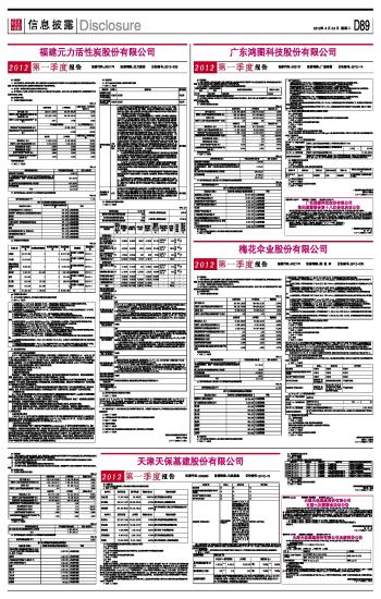 4.4 预测年初至下一报告期期末的累计净利润可能为亏损、实现扭亏为盈或者与上年同期相比发生大幅度变动的警示及原因说明 □ 适用 √ 不适用 4.5 向控股股东或其关联方提供资金、违反规定程序对外提供担保的情况 □ 适用 √ 不适用 4.6 证券投资情况 □ 适用 √ 不适用 4.7 按深交所相关备忘录规定应披露的报告期日常经营重大合同的情况 □ 适用 √ 不适用 福建元力活性炭股份有限公司 董事长:卢元健 二〇一二年四月二十四日 本版导读: