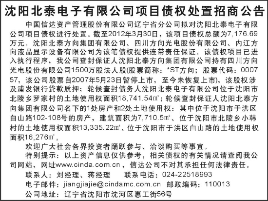 [AD]沈阳北泰电子有限公司项目债权处置招商公告