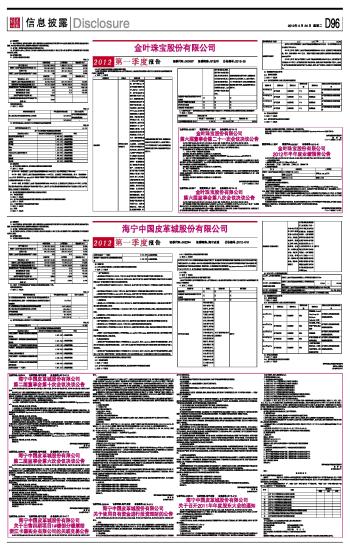 证券代码:002344 证券简称:海宁皮城 公告编号:2012-016 海宁中国皮革城股份有限公司2012第一季度报告 2012-04-24 来源:证券时报网 作者: