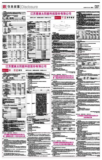 证券代码:002610 证券简称:爱康科技 公告编号:2012-20 江苏爱康太阳能科技股份有限公司2011年度报告摘要 2012-04-24 来源:证券时报网 作者: