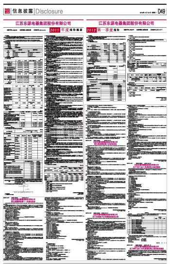 3.6 衍生品投资情况 □ 适用 √ 不适用 3.6.1 报告期末衍生品投资的持仓情况 □ 适用 √ 不适用 江苏东源电器集团股份有限公司 董事长: 孙益源 2012年4月20日 本版导读: