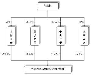 4.2 公司与实际控制人之间的产权及控制关系的方框图 ■ §5 董事会报告 5.1 管理层讨论与分析概要 2011年是"十二五"规划的开局之年,也是国家医改进一步推进,医药流通行业市场竞争格局变化较大的一年。国家加快推进基层医疗机构基本药物制度,推进公立医院的改革试点和县级医院综合改革试点,健全基层医疗卫生服务体系,医药行业整体需求仍保持持续增长。 2011年,国家"新医改2009-2011"政策实施进入经验总结阶段,未来国家医改将进入攻坚阶段,医药流通行业仍在改革、试点、探索中推进与发展,国家医改中出现的一些制度性问题,已充分显现。2011年,公司适应国家医改变化,顺应市场变革,在坚持优势业务的前提下,调整经营方式,创新业务模式,发展新兴业务,不断探索新的业务增长点,为公司未来快速发展打下了良好基础;进一步发挥技术优势,以技术服务为纽带,整合渠道资源,更好地服务终端,延伸产业链,提升营销管理及服务水平,增强公司的核心竞争力。公司全年分销业务稳步发展,战略业务如医院纯销、中药和中药材、医疗器械、零售连锁业务继续保持快速增长,新兴业务如医药电子商务、物流延伸增值服务等取得进展,成为公司未来发展的亮点。 报告期内,公司首次公开发行股票募投项目除上海和哈尔滨外,杭州、天津、厦门、安国(河北)和湖北的十堰、宜昌、恩施等7个项目已经建成并投入使用,公司在全国省级物流网络的投资布点进一步完善,公司内、外部资源整合的效率和作用逐步显现。 报告期内,受整体经营环境的影响,公司毛利率比上年度有所下降,管理费用和财务费用上升较快,直接导致营业利润降低。 1、报告期内公司整体经营情况 报告期内,公司实现营业收入248.39亿元、营业利润3.49亿元及净利润3.76亿元(其中归属于上市公司股东净利润3.74亿元),较上年同期的营业收入211.85亿元、营业利润4.45亿元及净利润3.66亿元(其中归属于上市公司股东净利润3.60亿元)分别增长17.25%-21.43%、2.73%(其中归属于上市公司股东净利润增长34.06%),营业利润下降21.43%的主要原因是公司报告期毛利率较上年同期有所下降以及报告期管理费用与财务费用上升较快所致;扣除非经常性损益后归属于上市公司股东的净利润为2.57亿元,较上年同期的3.36亿元下降23.64%,主要原因是报告期营业利润较上年同期下降21.43%。实现基本每股收益0.26元、稀释每股收益0.26元,扣除非经常性损益后基本每股收益0.18元、稀释每股收益0.18元。报告期内,公司经营活动现金流量净额-3.44亿元,较上年同期-10.34亿元有较大改善,主要原因是上年同期公司使用超募资金补充流动资金导致经营性现金流量净额出现较大负值所致。截至2011年12月31日,公司总资产118.39亿元,所有者权益43.04亿元,其中归属于上市公司股东的所有者权益为41.11亿元;期末每股净资产2.89元,加权平均净资产收益率为9.11%,扣除非经常性损益后加权平均净资产收益率为6.26%。报告期加权平均净资产收益率较上年同期有较大幅度下降,主要原因是公司首次公开发行股票募集资金投资项目还未产生效益所致。 2、报告期公司各项业务增长情况 (1)西药、中成药:报告期内,公司采取多方措施促进核心业务的增长,公司核心业务西药、中成药2011年继续保持稳定增长,全年实现销售收入225.07亿元、毛利额11.84亿元,销售收入较上年同期增长16.06%,毛利额较上年同期增长2.59%,毛利率为5.26%,较上年同期的5.95%下降了0.69个百分点,毛利率下降的主要原因是市场竞争较为激烈所致。原料药销售增长较快,报告期完成原料药销售额4.53亿元、较上年同期增长63.6%。 报告期内,核心业务强化了协议分类管理,重点协议专人管理,目标更明确,效果更好;大力拓展总代理业务,全年完成总代理销售2.4亿元,超额完成年度目标,总代理品种毛利率达24.1%;进一步强化基础管理,大库存占比、老批号占比与缺货率均稳中有降,控制良好;内部制度流程管理更加规范;项目工作成果显著,通过项目的推动,购销系统管控及操作新旧模式平稳过渡;购销系统内管理创新成果涌现,各下属公司产生了27个系统创新项目。 (2)中药材与中药饮片:报告期内,公司中药材与中药饮片业务继续保持快速增长,实现销售收入4.28亿元、毛利额9,638万元,分别较上年同期增长53.03%和35.91%;毛利率为22.51%,与上年同期的25.35%下降了2.84个百分点【注:报告期内公司兼并了湖北金贵中药饮片有限公司,因属同一控制人下的合并,公司对去年同期相关数据进行了追溯调整,导致相关数据可能存在与之前披露数据不同。下同】。其中中药材、精致贵细饮片成为重要增长点,销售额增长分别达到上年同期106%和65%。 报告期内,公司大力拓展中药业务,与劲酒有限公司合资成立了湖北九州通中药产业发展有限公司,公司占该公司注册资本的60%,并以该公司作为发展中药产业的平台,对中药资源进行整合,尝试对中药研发、种植加工和生产经营的产业链布局。截止报告公布日,公司及合资公司已成立11家中药类下属企业,业务涵盖研发、种植加工和生产经营;新成立的新疆和济中药饮片有限公司和河北楚风中药饮片有限公司已经建成并已通过生产许可证验收,为公司不断丰富中药饮片的产品线,扩大各公司的饮片生产与销售规模奠定了基础。报告期内,公司募投项目安国现代中药仓储中心建成并投入使用,该项目是公司在中国中