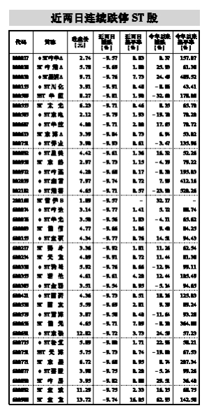 (专题数据由上海聚源数据服务有限公司提供,数据来源于上市公司公告,若有出入,请以公告为准) 尽管五一假期以来A股连续两日红盘报收,但受深沪交易所退市新政的影响,ST股却出现了大面积的下跌,初步统计,近两日共有37只ST股出现连续跌停。 由于之前上市公司的退市条件相对比较宽松,因而多只ST股往往靠非经常性损益等财务指标来调节公司的盈利,暂时避免了退市。而今年五一期间,深沪交易所发布了新版的主板及中小板上市公司退市制度的征求意见稿,新增了包括净资产和营业收入在内的多项退市条件,如果上市公司出现资不抵债,丧失持续经营的基础,或者营业收入过低已不能正常经营,将实行退市风险警示或暂停甚至终止上市,这种极为严厉的退市新政,加剧了ST股被淘汰的风险。 受退市新政冲击,ST板块近两日领跌,*ST宝硕、*ST东电、ST东盛等多只个股出现连续跌停。事实上在新政推出之前,由于ST股的业绩多数难以支撑股价,部分ST股早已出现多日的下跌,统计显示,ST东盛、ST南化两只股已连续下跌7天,*ST锌业连续下跌6天,但最近4天均是一开盘就被牢牢的封住跌停;当然,在ST股大面积跌停的同时,*ST大地、*ST大成等19只股近两日却不跌反涨,*ST大成3月30日起被实行退市风险警示,但随之公司的重大资产置换、发行股份购买资产的申请获证监会通过,重组预期使得公司股价出现大涨。(余莉) 本版导读: