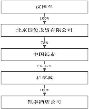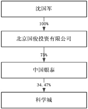 五、公司控股股东和实际控制人概况 截至本摘要签署之日,公司控股股东中国银泰持有公司总股本的34.47%。中国银泰之基本情况如下: 1、公司名称:中国银泰投资有限公司 2、法定代表人:沈国军 3、成立日期:1996年12月25日 4、注册资本:人民币3亿元 5、主营业务:资产托管、重组与经营;农、林、牧、渔业的投资开发与经营;高新技术产业投资开发与经营;卫生用品、劳保用品的研制、销售;商业百货零售业的投资与经营。 北京国俊投资有限公司为中国银泰之控股股东,持有中国银泰75%股权,其基本情况如下: 1、公司名称:北京国俊投资有限公司 2、法定代表人:沈国军 3、成立日期:2001年9月25日 4、注册资本:5,000.00万元 5、主营业务:资产托管、重组与经营;接受委托对企业进行经营管理、财务顾问、市场调查、信息咨询、投资咨询等 自然人沈国军先生为北京国俊投资有限公司之实际控制人,持有北京国俊投资有限公司100%股权。沈国军先生基本情况如下: 姓名:沈国军 国籍:中华人民共和国 身份证号:33010619620731**** 是否取得其他国家或地区居留权:无 近五年内主要职务:自1997年起至今,任中国银泰董事长、总裁。 沈国军为科学城之最终实际控制人,股权关系图示如下: ■ 第三章 交易对方的基本情况 本次重大资产重组的交易对方为中国银泰、自然人侯仁峰、自然人王水与自然人李红磊,其中:拟发行股份购买资产的交易对方为合计持有玉龙矿业69.4685%股权的自然人侯仁峰、自然人王水与自然人李红磊;拟置出资产和募集配套资金的交易对方为科学城之控股股东中国银泰。 一、拟购买资产的交易对方 (一)拟购买资产的交易对方概况 本次拟购买资产交易涉及的交易对方如下表: