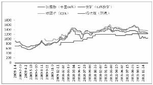数据来源:首钢迁钢公司,总成本=营业成本+试生产成本,下同。 2009年以来,原燃料价格逐步上涨导致钢铁企业成本上升。据中国钢铁工业协会统计,2011年,钢铁企业炼焦煤的平均采购成本同比上涨约14%,国产铁精矿的平均采购成本上升约21%,进口粉矿的平均采购成本提高约27%。由于原燃料价格上涨,全年钢铁企业的炼钢生铁成本上涨约20%。 图:2009年以来炼钢原料价格情况(元/吨) ■ 数据来源:WIND资讯,截至2011年12月底 2、动力能源用水采购情况 2009年、2010年及2011年,首钢迁钢公司的主要动力能源对外采购情况如下表所示: