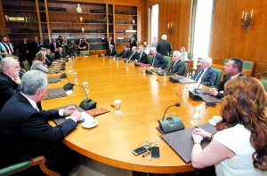 由皮克拉梅诺斯任总理的希腊看守政府昨日宣誓就职。新政府的主要任务是领导国家在一个月后再次举行议会选举。最新民意调查显示,左派政党联盟有可能在下次大选中成为议会第一大党,但难以单独组阁,希腊可能陷入新的政治僵局,无序违约及退出欧元区的问题会再度凸显。图为新内阁就职仪式后举行首次内阁会议。 (CFP/供图) 本版导读: