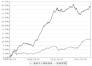 2、自基金合同生效以来富国天丰强化收益债券型证券投资基金累计份额净值增长率与业绩比较基准收益率的历史走势对比图 ■ 注:(1)截止日期为2012年3月31日。 (2)本基金合同生效日为2008年10月24日,建仓期6个月,即从2008年10月24日起至2009年4月23日,建仓期结束时各项资产配置比例均符合基金合同约定。 十三、费用概览 (一)与基金运作有关的费用 1、与基金运作有关费用列示 (1)基金管理人的管理费; (2)基金托管人的托管费; (3)基金财产拨划支付的银行费用; (4)基金合同生效后的基金信息披露费用; (5)基金份额持有人大会费用; (6)基金合同生效后与基金有关的会计师费和律师费; (7)基金的证券交易费用; (8)在中国证监会规定允许的前提下,本基金可以从基金财产中计提销售服务费,具体计提方法、计提标准在招募说明书或相关公告中载明; (9)依法可以在基金财产中列支的其他费用。 上述基金费用由基金管理人在法律规定的范围内参照公允的市场价格确定,法律法规另有规定时从其规定。 2、基金费用计提方法、计提标准和支付方式 (1)基金管理人的管理费 在通常情况下,基金管理费按前一日基金资产净值的0.6%年费率计提。计算方法如下: H=E×年管理费率÷当年天数 H为每日应计提的基金管理费 E为前一日基金资产净值 基金管理费每日计提,按月支付。由基金管理人向基金托管人发送基金管理费划付指令,经基金托管人复核后于次月首日起3个工作日内从基金财产中一次性支付给基金管理人,若遇法定节假日、休息日,支付日期顺延。 (2)基金托管人的托管费 在通常情况下,基金托管费按前一日基金资产净值的0.2%年费率计提。计算方法如下: H=E×年托管费率÷当年天数 H为每日应计提的基金托管费 E为前一日基金资产净值 基金托管费每日计提,按月支付。由基金管理人向基金托管人发送基金托管费划付指令,经基金托管人复核后于次月首日起3个工作日内从基金财产中一次性支付给基金托管人,若遇法定节假日、休息日,支付日期顺延。 (3)除管理费和托管费之外的基金费用,由基金托管人根据其他有关法规及相应协议的规定,按费用支出金额支付,列入或摊入当期基金费用。。 (二)与基金销售有关的费用 1、申购费用 本基金提供两种申购费用的支付模式。投资人可以选择前端收费模式,即在申购时支付申购费用;也可以选择后端收费模式,即在赎回时才支付相应的申购费用,该费用随基金份额的持有时间递减。本基金的申购费用由基金申购人承担,不列入基金财产,主要用于本基金的市场推广、销售、登记结算等各项费用。 (1)投资者选择交纳前端申购费用时,按申购金额采用比例费率。投资者在一天之内如果有多笔申购,适用费率按单笔分别计算。具体费率如下: