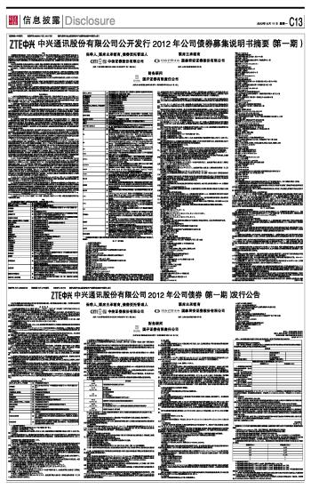 中兴通讯股份有限公司2012年公司债券(第一期)发行公告