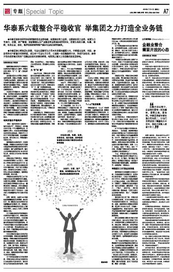 证券时报记者 李东亮 历时六年的华泰证券与华泰联合证券整合已然收官,但带给业界的思考却远未结束。 华泰证券以兼容并蓄的多元文化,逐步构建起包括证券、基金、期货和银行业务在内的证券控股集团,尤其是在与华泰联合证券整合的过程中所体现出来的开放心态,更值得业界思考。 2007年,华泰证券在业内率先提出打造证券控股集团,而随着与华泰联合证券整合的收尾,整个架构和模块基本完成。从提出思路到得以实现,历时5年之久,只为实现最终的战略目标:举集团之力打造全业务链。其间,国内各大券商均将着力点放在再融资和具体业务的拓展上,仅就各自掌握的资源和服务客户能力的广度而言,华泰证券显然已走在了行业前列。 值得一提的是,华泰证券并未止步于证券控股集团的形式。2011年年中,华泰证券正式提出举集团之力打造全业务链的战略构想,即以客户需求为导向,把跨部门、跨模块的关联业务整合成一体化业务链条,最终形成一个客户、一个账户、一系列产品、一揽子综合服务的统一服务体系。从服务的广度转向服务的深度又是华泰证券领先行业的一大创举。 开放的心态并非易事,它源于企业文化基因中的包容,而这一点可以在华泰系整合过程中得到充分的体现,7月3日华泰证券公告华泰联合证券高管变更信息时对前任董事长盛希泰、前任总裁马俊生“在任职期间为公司及华泰联合证券发展所做的贡献表示衷心的感谢”,华泰联合证券内部人士说,“ 盛总和马总一直是推动整合工作的关键人物,整个过程都有他们贡献的智慧。” 华泰证券董事长吴万善在谈及华泰系的融合时曾明确表示:在融合的过程中,企业首先要有一定的胸怀,要看主流,要包容。华泰证券文化比较包容,能善待被收购公司的员工,让他们觉得受到了尊重和公平对待,因此大多数人都留下来了。这在华泰证券收购亚洲证券,合并信泰证券的历程中已经得到了验证。 一位在整合过程中离职的员工曾私下向记者透露,联合证券拖欠的奖金,华泰证券收购后全部都发了,这让很多人至今感慨良多。 尽管被华泰证券收购后,华泰联合证券高管几经更迭,但不论是盛希泰、马俊生,还是刘晓丹,均出自原联合证券。而目前华泰证券销售交易部、财富管理部、固定收益部等重要业务部门的主要负责人都是来自华泰联合的业务骨干。 华泰证券总裁周易对业务整合提出的原则是要优势互补、强强联合、通力合作,要进一步发扬华泰联合证券市场化程度高、市场竞争意识优、竞争力强的优势,要继续巩固华泰证券持续稳健,当前和长远兼顾的特色,形成更富于活力和战斗力的新华泰业务体系。 这一思路已在整合实践中得到华泰联合管理层和员工的广泛认同。华泰联合证券新任总裁刘晓丹向记者形象地介绍两家公司的风格,“华泰证券是厚重的,华泰联合是轻盈的”。 在刘晓丹看来,整合后的华泰与华泰联合将各取所长;华泰系的整合始终是渐进式的,在保留华泰联合市场化机制和文化的基础上,兼蓄华泰证券长期激励机制和风控治理水平;无论是调机制还是调架构,目的都非常明确:稳定存量队伍,吸引更多一流人才加盟,打造适应未来市场竞争格局的一流投行。 本版导读: