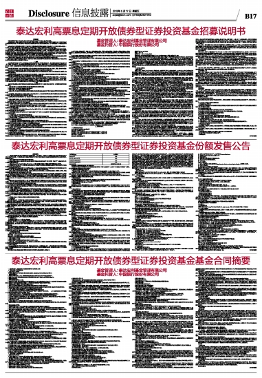 泰达宏利高票息定期开放债券型证券投资基金基金合同摘要 2013-05-17 来源:证券时报网 作者: