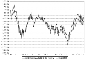 2、自基金合同生效以来富国中证500指数增强型证券投资基金(LOF)累计份额净值增长率与业绩比较基准收益率的历史走势对比图 ■ 注:1.截止日期为2013年3月31日。 2.本基金于2011年10月12日成立,建仓期6个月,从2011年10月12日至2012年4月11日,建仓期结束时各项资产配置比例均符合基金合同约定。 十三、费用概览 (一)与基金运作有关的费用 1、基金费用的种类 (1)基金管理人的管理费; (2)基金托管人的托管费; (3)基金合同生效后的信息披露费用; (4)基金上市费及年费; (5)基金份额持有人大会费用; (6)基金合同生效后与基金有关的会计师费、律师费和诉讼费; (7)基金的证券交易费用; (8)基金的指数使用费; (9)基金财产拨划支付的银行费用; (10)证券账户开户费用和银行账户维护费; (11)按照国家有关规定和基金合同约定可以在基金财产中列支的其他费用。 上述基金费用由基金管理人在法律法规规定的范围内按照公允的市场价格确定,法律法规和基金合同另有规定时从其规定。 2、基金费用计提方法、计提标准和支付方式 (1)基金管理人的管理费 在通常情况下,基金管理费按前一日基金资产净值的年费率计提。计算方法如下: H=E×年管理费率÷当年天数,本基金年管理费率为1% H为每日应计提的基金管理费 E为前一日基金资产净值 基金管理费每日计提,按月支付。由基金管理人向基金托管人发送基金管理费划付指令,经基金托管人复核后于次月首日起3个工作日内从基金财产中一次性支付给基金管理人,若遇法定节假日、休息日或不可抗力致使无法按时支付的,支付日期顺延至最近可支付日支付。 (2)基金托管人的托管费 在通常情况下,基金托管费按前一日基金资产净值的年费率计提。计算方法如下: H=E×年托管费率÷当年天数,本基金年托管费率为0.15% H为每日应计提的基金托管费 E为前一日基金资产净值 基金托管费每日计提,按月支付。由基金管理人向基金托管人发送基金托管费划付指令,经基金托管人复核后于次月首日起3个工作日内从基金财产中一次性支付给基金托管人,若遇法定节假日、休息日,支付日期顺延。 (3)基金的指数使用费 本基金作为指数基金,需根据与中证指数有限公司签署的指数使用许可协议的约定向中证指数有限公司支付标的指数许可使用费。指数许可使用费在通常情况下按前一日的基金资产净值的0.016%的年费率计提。指数许可使用费每日计算,逐日累计。 计算方法如下: H=E×0.016%÷当年天数 H为每日应付的指数许可使用费 E为前一日基金资产净值 指数许可使用费的收取下限为每季度人民币5万元。 由于中证指数有限公司保留变更或提高指数使用费的权利,如果指数使用费的计算方法、费率等发生调整,本基金将采用调整后的方法或费率计算指数使用费。基金管理人应及时按照《信息披露办法》的规定在指定媒体进行公告。 (4)上述(一)中3到10项费用由基金托管人根据其他有关法律法规及相应协议的规定,按费用支出金额支付,列入或摊入当期基金费用。 (二)与基金销售有关的费用 1、申购费率 (1)本基金的场外申购费率 本基金对通过直销柜台申购的养老金客户与除此之外的其他投资者实施差别的申购费率。 A、申购费率