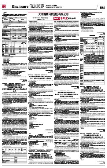 证券代码:002337 证券简称:赛象科技 公告编号:2013-051 天津赛象科技股份有限公司 董事会2013半年度募集资金存放与 使用情况的专项报告 本公司及董事会全体成员保证信息披露内容的真实、准确和完整,没有虚假记载、误导性陈述或重大遗漏。 一、募集资金基本情况 经中国证券监督管理委员会证监发行字[2009]1401号文核准,并经深圳证券交易所同意, 本公司由主承销商渤海证券股份有限公司于2010年1月5日向社会公众公开发行普通股(A 股)股票3,000万股,每股面值 1 元,每股发行价人民币31.00元。截至2010年1月8日止,本公司共募集资金人民币930,000,000.00元,扣除与发行有关的费用人民币28,767,000.00元,实际募集资金净额为人民币901,233,000.00元。 截至2010年1月8日,本公司上述发行募集的资金已全部到位,已经立信大华会计师事务所有限公司以 “立信大华验字[2010]4号”验资报告验证确认。实际募集资金净额为人民币901,233,000.00元,与验资报告差额4,343,000.00元,系依据财政部财会[2010]25号文将路演费等费用应计入当期费用不应冲减资本公积而形成的差额。 截至2013年6月30日,公司使用募集资金合计为人民币638,713,999.05元;其中募集资金置换预先已投入募集资金投资项目的自筹资金99,389,683.73元;本报告期直接投入募集资金项目43,276,874.90元,累计直接投入募集资金项目金额264,641,315.32元;本期未发生募集资金超额部分补充流动资金的情况,截至本报告期末累计使用募集资金超额部份补充流动资金274,683,000.00元。本报告期募集资金账户利息收入扣除手续费支出后产生净收入9,054,928.77元,累计净收入42,606,773.16元。截至2013年6月30日,募集资金余额为人民币305,125,774.11元。 二、募集资金存放和管理情况 为了规范募集资金的管理和使用,保护投资者权益,本公司依照《公司法》、《证券法》、《深圳证券交易所股票上市规则》、《深圳证券交易所中小企业板上市公司规范运作指引》等法律法规,结合公司实际情况,制定了《天津赛象科技股份有限公司募集资金管理办法》(以下简称“管理办法”),该《管理办法》经本公司三届十一次董事会审议通过,并已经本公司 2008年年度股东大会表决通过。根据《管理办法》的要求,并结合公司经营需要,本公司对募集资金实行专户存储,并对募集资金的使用实行严格的审批手续,以保证专款专用;授权保荐代表人可以随时到开设募集资金专户的银行查询募集资金专户资料,并要求保荐代表人每季度对募集资金管理和使用情况至少进行现场调查一次。根据本公司与保荐机构渤海证券股份有限公司签订的《保荐协议》,公司单次从募集资金存款户中支取的金额达到人民币1,000万元以上的或累计从募集资金存款户中支取的金额达到募集资金总额的5%的,公司应当以书面形式知会保荐代表人,同时经公司董事会授权,保荐代表人可以根据需要随时到开设募集资金专户的商业银行查询募集资金专户资料。 公司于2010年2月8日与保荐人渤海证券股份有限公司、渤海银行股份有限公司天津围堤道支行签订了《募集资金三方监管协议》,公司在渤海银行股份有限公司天津围堤道支行开设募集资金专项账户,账号为2000005169010392,经审核,此监管协议与深圳证券交易所三方监管协议范本不存在重大差异,协议的履行不存在问题。 截至2013年6月30日止,募集资金的存储情况列示如下: 金额单位:人民币元