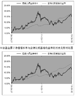 注:本基金建仓期自2008年9月27日至2009年3月26日,建仓期结束时资产配置比例符合本基金基金合同规定。 十三、费用概览 (一)与基金运作有关的费用 1、费用的种类 (1)基金管理人的管理费; (2)基金托管人的托管费; (3)基金财产拨划支付的银行费用; (4)基金合同生效后的信息披露费用; (5)基金份额持有人大会费用; (6)基金合同生效后与基金有关的会计师费和律师费; (7)基金的证券交易费用; (8)在中国证监会规定允许的前提下,本基金可以从基金财产中计提销售服务费,销售服务费的具体计提方法、计提标准在招募说明书或有关公告中载明; (9)按照国家有关规定可以在基金财产中列支的其他费用。 2、上述基金费用由基金管理人在法律规定的范围内按照公允的市场价格确定,法律法规另有规定时从其规定。 3、基金运作费用计提方法、计提标准和支付方式 (1)基金管理人的管理费 在通常情况下,基金管理费按前一日基金资产净值的0.7%年费率计提。计算方法如下: H=E×年管理费率÷当年天数, H为每日应计提的基金管理费 E为前一日基金资产净值 基金管理费每日计提,按月支付。由基金管理人向基金托管人发送基金管理费划付指令,经基金托管人复核后于次月首日起3个工作日内从基金财产中一次性支付给基金管理人,若遇法定节假日、休息日,支付日期顺延。 (2)基金托管人的托管费 在通常情况下,基金托管费按前一日基金资产净值的0.2%年费率计提。计算方法如下: H=E×年托管费率÷当年天数 H为每日应计提的基金托管费 E为前一日基金资产净值 基金托管费每日计提,按月支付。由基金管理人向基金托管人发送基金托管费划付指令,经基金托管人复核后于次月首日起3个工作日内从基金财产中一次性支付给基金托管人,若遇法定节假日、休息日,支付日期顺延。 (3)B类基金份额的销售服务费 本基金A类基金份额不收取销售服务费,B类基金份额的年销售服务费率为0.4%。 在通常情况下,B类基金份额销售服务费按前一日B类基金份额资产净值的0.4%年费率计提。计算方法如下: H=E×年销售服务费率÷当年天数 H为B类基金份额每日应计提的销售服务费 E为B类基金份额前一日资产净值 B类基金份额销售服务费每日计提,按月支付。由基金管理人向基金托管人发送基金销售服务费划付指令,经基金托管人复核后于次月首日起3个工作日内从基金财产中一次性支付给注册登记机构,由注册登记机构代付给销售机构,若遇法定节假日、休息日,支付日期顺延。 (4)除管理费、托管费和销售服务费之外的基金费用,由基金托管人根据其他有关法律法规及相应协议的规定,按费用支出金额支付,列入或摊入当期基金费用。 (二)与基金销售有关的费用 1、本基金的申购费率如下: ■ (注:M:申购金额;单位:元) 2、本基金的赎回费率如下: ■ (注:Y:持有时间,其中1年为365天,2年为730天) 本基金的赎回费用由赎回人承担,其中25%的部分归入基金财产,其余部分用于支付注册登记费等相关手续费。 十四、对招募说明书更新部分的说明 基金管理人依据《中华人民共和国证券投资基金法》、《证券投资基金运作管理办法》、《证券投资基金销售管理办法》、《证券投资基金信息披露管理办法》及其它有关法律法规的要求,对本基金招募说明书进行了更新,主要更新内容列示如下: 1、 在“重要提示”部分更新了相应日期。 2、 在“第三部分 基金管理人”,将“管理人概况”中的管理人联系人由隋晓炜变更为林军;在“主要人员情况”部分,更新了董事会成员、经营管理层人员、基金经理以及投资决策委员会成员的情况。 3、 在“第四部分 基金托管人”部分,根据实际情况对相关内容进行了更新。 4、 在“第五部分 相关服务机构”部分,在“直销机构联系人”部分,将联系人由殷宇飞变更为杨雁;在“代销机构”部分,根据实际情况对代销机构的相关信息进行了更新;在“注册登记机构”部分,将“基本信息同上”变更为注册登记机构的具体信息。 5、 在“第十部分 基金的投资”部分,更新了“基金投资组合报告”,本基金投资组合报告的财务数据截止至2013年6月30日。 6、 更新了“第十一部分 基金的业绩”,数据截止至2013年6月30日。 7、 在“第二十二部分 对基金份额持有人的服务”部分中,将基金份额持有人所获红利转化为基金份额的净值计算基准日由“除息日”变更为“红利发放日”。 8、 在“第二十三部分 其他应披露事项”部分,披露了自2013年3月28日以来涉及本基金的相关公告。 信诚基金管理有限公司 2013年11月9日 本版导读:
