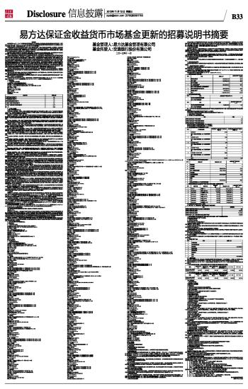 十三、费用概览 一、基金费用的种类 1、基金管理人的管理费; 2、基金托管人的托管费; 3、销售服务费; 4、《基金合同》生效后与基金相关的信息披露费用; 5、《基金合同》生效后与基金相关的会计师费、律师费、诉讼费和仲裁费; 6、基金上市费及年费; 7、基金托管人办理清算、交割过程中相关的银行日内垫资费用; 8、基金份额持有人大会费用; 9、基金的证券交易费用; 10、基金的银行汇划费用; 11、证券账户开户费用、银行账户维护费用; 12、银行对本基金授信所产生的费用; 13、按照国家有关规定和《基金合同》约定,可以在基金财产中列支的其他费用。 二、基金费用计提方法、计提标准和支付方式 1、基金管理人的管理费 本基金的管理费按前一日基金资产净值的0.20%年费率计提。管理费的计算方法如下: H=E×0.20%÷当年天数 H为每日应计提的基金管理费 E为前一日的基金资产净值 基金管理费每日计算,逐日累计至每月月末,按月支付,基金管理人和基金托管人核对一致后,由基金托管人于次月前3个工作日内从基金财产中一次性支付给基金管理人。若遇法定节假日、公休假或不可抗力等,支付日期顺延。 2、基金托管人的托管费 本基金的托管费按前一日基金资产净值的0.08%的年费率计提。托管费的计算方法如下: H=E×0.08%÷当年天数 H为每日应计提的基金托管费 E为前一日的基金资产净值 基金托管费每日计算,逐日累计至每月月末,按月支付,基金管理人和基金托管人核对一致后,由基金托管人于次月前3个工作日内从基金财产中一次性支取。若遇法定节假日、公休日或不可抗力等,支付日期顺延。 3、销售服务费 本基金A类基金份额的销售服务费年费率为0.25%;B类基金份额的销售服务费年费率为0。对于A类份额升级为B类份额或B类份额降级为A类份额,基金年销售服务费自份额类别变化后下一工作日起适用于新份额类别的费率。 销售服务费的计算方法如下: H=E×R÷当年天数 H 为该类基金份额每日应计提的销售服务费 E 为该类基金份额前一日的基金资产净值 R为该类基金份额适用的销售服务费年费率 销售服务费每日计提,按月支付。基金管理人和基金托管人核对一致后,由基金托管人于次月前3个工作日内从基金资产中划出,经登记结算机构或基金管理人支付给各个基金销售机构。若遇法定节假日、公休日或不可抗力等,支付日期顺延。 销售服务费主要用于支付销售机构佣金、以及基金管理人的基金行销广告费、促销活动费、持有人服务费等。基金募集期间的上述费用不从销售服务费中列支。 上述“一、基金费用的种类中第4-12项费用”,根据有关法规及相应协议规定,按费用实际支出金额列入当期费用,由基金托管人从基金财产中支付。 三、不列入基金费用的项目 下列费用不列入基金费用: 1、基金管理人和基金托管人因未履行或未完全履行义务导致的费用支出或基金财产的损失; 2、基金管理人和基金托管人处理与基金运作无关的事项发生的费用; 3、《基金合同》生效前的相关费用; 4、其他根据相关法律法规及中国证监会的有关规定不得列入基金费用的项目。 四、与基金销售有关的费用 本基金不收取申购费用和赎回费用。 五、费用调整 基金管理人和基金托管人协商一致后,可按照基金发展情况,并根据法律法规规定和基金合同约定调整基金管理费率、基金托管费率、基金销售服务费率等相关费率。 调低基金管理费率、基金托管费率、基金销售服务费率等费率,无须召开基金份额持有人大会。 基金管理人必须于新的费率实施日前在指定媒体上公告。 十四、对招募说明书更新部分的说明 本基金管理人依据《中华人民共和国证券投资基金法》、《证券投资基金信息披露管理办法》等有关法律法规及《易方达保证金收益货币市场基金基金合同》,结合本基金管理人对本基金实施的投资管理活动,对2013年3月20日刊登的本基金的招募说明书进行了更新,主要更新的内容如下: 1. 在“三、基金管理人”部分,更新了 “(二)主要人员情况”部分的内容。 2. 在“四、基金托管人”部分,根据最新资料进行了更新。 3. 在“五、相关服务机构”部分,更新了基金份额发售机构信息和会计师事务所信息。 4. 将“七、基金的募集安排”改为“七、基金的募集”,更新了部分内容,概述了基金的募集情况。 5. 更新了“八、基金合同的生效”部分的内容,概述了基金合同生效的情况。 6. 在“九、基金份额的申购、赎回”部分,根据《关于易方达保证金收益货币市场基金调整申购赎回清单中申赎数量限制指标的公告》,调整了“7.申购、赎回清单的内容与格式”的部分内容,并更新了部分表述。 7. 在“十、基金的投资”部分,补充了本基金2013年第2季度投资组合报告的内容。 8. 增加了“十一、基金的业绩”部分,补充了基金合同生效以来的投资业绩数据,并相应调整其他部分的序号。 9. 在“十五、基金的费用与税收”部分,更新了部分内容。 10. 在“二十一、基金托管协议的内容摘要”部分,更新了“一、托管协议当事人”部分的内容。 11. 在“二十三、其他应披露事项”部分,根据相关公告的内容进行了补充。 易方达基金管理有限公司 2013年11月13日 本版导读:
