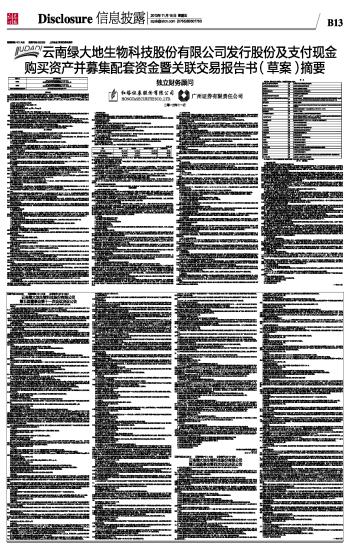 公司声明 本报告书摘要的目的仅为向公众提供有关本次重组的简要情况,并不包括《《云南绿大地生物科技股份有限公司发行股份及支付现金购买资产并募集配套资金暨关联交易报告书(草案)》全文的各部分内容。《云南绿大地生物科技股份有限公司发行股份及支付现金购买资产并募集配套资金暨关联交易报告书(草案)》全文同时刊载于深圳证券交易所网站(www.szse.cn)和巨潮资讯网(www.cninfo.com.cn);备查文件的查阅方式为:投资者可在本报告书刊登后至本次交易完成前的每周一至周五上午9:00-11:00,下午3:00 至5:00,于下列地点查阅上述文件: 1、云南绿大地生物科技股份有限公司 办公地址:昆明市经济技术开发区经浦路6号 2、红塔证券股份有限公司 办公地址:云南省昆明市北京路155号附1号2405室 3、广州证券有限责任公司 办公地址:广州市天河区珠江西路5号广州国际金融中心19层、20层 本公司及董事会全体成员保证《云南绿大地生物科技股份有限公司发行股份及支付现金购买资产并募集配套资金暨关联交易报告书(草案)》及其摘要内容的真实、准确、完整,对报告书及其摘要的虚假记载、误导性陈述或重大遗漏负连带责任。 本公司负责人、主管会计工作的负责人和会计机构负责人保证本报告书及其摘要中财务会计资料真实、完整。 本次发行股份及支付现金购买资产并募集配套资金的交易对方,保证其为本次发行股份及支付现金购买资产所提供的有关信息真实、准确和完整,不存在虚假记载、误导性陈述或者重大遗漏,并对所提供信息的真实性、准确性和完整性承担个别和连带的法律责任。 本次交易尚需取得有关审批机关的批准和核准。审批机关对于本次交易相关事项所做的任何决定或意见,均不表明其对本公司股票的价值或投资者的收益作出实质性判断或保证。任何与之相反的声明均属虚假不实陈述。 本次交易完成后,公司经营与收益的变化,由公司自行负责;因本次交易引致的投资风险,由投资者自行负责。 投资者若对本报告书存在任何疑问,应咨询自己的股票经纪人、律师、专业会计师或其他专业顾问。 重大事项提示 一、本次交易方案概述 本公司拟向自然人徐洪尧发行不超过1,234.2402万股股份购买其持有的洪尧园林31%股权,拟向自然人张国英发行不超过1,194.4260万股股份及支付3,000万元现金购买其持有的洪尧园林35%股权,交易对价合计39,600万元。 同时,本公司拟向云投集团发行不超过875.92万股股份募集配套资金13,200万元,不超过本次交易总金额的25%。募集资金中的3,000万元将用于支付标的资产的现金对价部分,剩余募集资金净额将用于补充上市公司流动资金。 二、发行股份及支付现金购买资产的简要情况 本次交易,绿大地将向徐洪尧、张国英发行股份及支付现金购买其合计持有的洪尧园林66%股权。 (一)发行股份的定价原则 本次发行股份的定价基准日为公司第五届董事会第十一次会议决议公告日,即2013年11月15日。绿大地向徐洪尧、张国英发行股票的发行价格为定价基准日前二十个交易日股票交易均价,即15.07元/股。最终发行价格需经本公司股东大会批准。定价基准日至本次发行期间,公司如有派息、送股、资本公积金转增股本等除权除息事项,本次发行价格亦将作相应调整。 (二)标的资产的交易价格 本次交易中,标的资产的交易价格以具有证券期货业务资格的资产评估机构出具的评估报告的评估结果为依据,经交易各方协商确定。经中和评估出具“中和评报字(2013)第KMV1157号”并经云南省国资委“2013-108号”备案,洪尧园林100%股权评估价值为60,380万元,经交易各方协商确定作价60,000万元,标的资产的交易价格确定为39,600万元,其中,以现金方式支付3,000万元,其余36,600万元以发行股份的方式支付,按照发行价格15.07元/股计算,本次交易将向徐洪尧、张国英合计发行不超过2,428.67万股。 (三)锁定期 资产出售方徐洪尧和张国英分别承诺,其所认购的绿大地本次发行的股份,自股份发行结束之日起三十六个月内不上市交易和转让。在上述锁定期限届满后,其交易和转让按照届时有效的法律、法规和深圳证券交易所的相关规定办理。 三、对价调整 交易对方徐洪尧及张国英承诺2013年、2014年和2015年洪尧园林合并报表口径下扣除非经常性损益后的归属于母公司所有者的净利润将不低于4,500万元、5,850万元和7,605万元,合计17,955万元。假设洪尧园林超额完成承诺利润,并且在洪尧园林2013年、2014年和2015年任何一年截至当期期末累计实现利润均不低于截至当期期末累计承诺利润的前提下,按以下原则对交易对价进行调整: (1)若洪尧园林2013年、2014年和2015年实际归属于母公司所有者的净利润合计在2.34亿元(含本数)至2.50亿元(不含本数),则洪尧园林100%股权作价调整为6.92亿元,拟购买标的资产交易价格(66%股权的对应价格)调整为45,672万元; (2)若洪尧园林2013年、2014年和2015年实际归属于母公司所有者的净利润合计不低于2.50亿元,则洪尧园林100%股权作价调整为7.50亿元,拟购买标的资产交易价格(66%股权的对应价格)调整为49,500万元。 以上对价调整条款中的净利润和承诺净利润确定的标准一致。 对价调整的结算时间为洪尧园林2015年专项审计报告出具后十个工作日内。标的资产价格调整增加的金额,本公司应在洪尧园林2015年专项审计报告出具后三个月内以