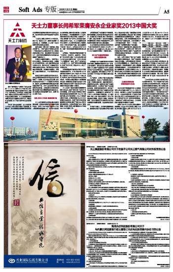 2001.12.31 2012.12.31 比值 营业收入 6.85亿元 93.01亿元 13.58倍 净利润 1.03亿元 7.92亿元 7.69倍 上市以来,公司每年坚持稳定的现金分红回报投资者,每年派息都接近或不低于10派3的水平,目前已累计分红17.48亿元。现金分红回报数额已经接近公司2002年首发募集以及2007年、2010年的定向增发募集,三次募集资金20.91亿元的总和。 公司热心社会公益事业,把回报社会、奉献社会作为自己的使命。自2008年至今,公司连续披露社会责任报告,对公司在社会责任的履行加以阐述。公司通过个人捐赠、企业捐助等多种形式,积极参与社会救济、抗震救灾、文化传承、慈善宣传等各项活动。董事局主席闫希军先生曾获得“爱心中国—首届中华慈善人物”和“全国十大社会公益之星”称号等。 正如本届安永企业家奖中国项目联合主席蔡伟荣所言,“2013年获得中国大奖的企业家们走在经济转型的前沿,有效地应对全球经济放缓的多重挑战,同时也将社会效益与企业经济效益相结合,以创新的方式解决社会问题,为企业带来新商机”。天士力在闫希军董事长带领下,一直引领我国中药产业走在现代化和国际化发展的最前沿,以持续的科技创新,让传统国粹产业不断焕发出新的商机。目前复方丹参滴丸FDA三期临床试验正在打通现代中药的国际化通路,假以时日,我们相信承载着五千年中华文化的中药产品将在天士力的带领下漂洋过海,为全世界更大范围的需求者带去福祉。 (张芳) 本版导读:
