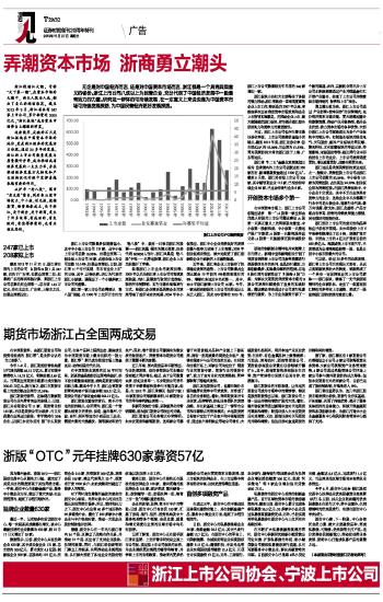 浙江钱塘江大潮,号称“天下第一潮”。在资本市场的大潮中,浙江人敢为人先、翻出了自己的绚丽浪花。截至2013年9月,浙江省共有247家上市公司,累计融资近3000亿元,“浙江板块”成为资本市场舞台上耀眼的明星。 这些数字,反映的不只是浙江板块在中国资本市场的地位,更是浙江经济的发展活力体现。通过20多年的发展,浙江的上市公司数量发展与质量提升并举,成为推动我省经济发展的一支生力军,并在推动经济发展方式转变和产业结构优化升级中发挥着越来越重要的作用。 从沪市“老八股”、深市“老五股”登台,到后来B股市场设立,中小板、创业板、股指期货、融资融券成立,关于浙江,关于浙企,关于浙商,发生了许多故事,有成功的、有失败的,有值得推崇的,也有应该反思的。