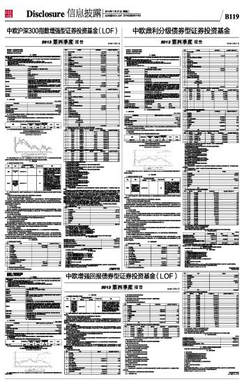 基金管理人:中欧基金管理有限公司 基金托管人:中信银行股份有限公司 报告送出日期:2014年01月21日 §1 重要提示 ■ §2 基金产品概况 ■ §3 主要财务指标和基金净值表现 3.1 主要财务指标 单位:人民币元 ■ 注:1.本期已实现收益指基金本期利息收入、投资收益、其他收入(不含公允价值变动收益)扣除相关费用后的余额,本期利润为本期已实现收益加上本期公允价值变动收益。 2.所述基金业绩指标不包括持有人认购或交易基金的各项费用,计入费用后实际收益水平要低于所列数字。 3.2 基金净值表现 3.2.1 本报告期基金份额净值增长率及其与同期业绩比较基准收益率的比较 ■ 3.2.2 自基金合同生效以来基金累计份额净值增长率变动及其与同期业绩比较基准收益率变动的比较 中欧鼎利分级债券型证券投资基金 累计份额净值增长率与业绩比较基准收益率历史走势对比图 (2011年06月16日-2013年12月31日) ■ 注:本基金合同生效日为2011年6月16日,建仓期为2011年6月16日至2011年12月15日,建仓期结束时各项资产配置比例符合本基金基金合同规定。 §4 管理人报告 4.1 基金经理(或基金经理小组)简介 ■ 注:1、任职日期和离任日期一般情况下指公司作出决定之日;若该基金经理自基金合同生效日起即任职,则任职日期为基金合同生效日。 2、证券从业的含义遵从行业协会《证券业从业人员资格管理办法》的相关规定。 4.2 管理人对报告期内本基金运作遵规守信情况的说明 本报告期内,本基金管理人严格遵循了《证券投资基金法》及其各项实施细则、《中欧鼎利分级债券型证券投资基金合同》和其他相关法律法规的规定,本着诚实信用、勤勉尽责、取信于市场、取信于社会的原则管理和运用基金资产,为基金份额持有人谋求最大利益。本报告期内,基金投资管理符合有关法规和基金合同的规定,无违法违规、未履行基金合同承诺或损害基金份额持有人利益的行为。 4.3 公平交易专项说明 4.3.1 公平交易制度的执行情况 报告期内,本基金管理人严格按照《证券投资基金管理公司公平交易制度指导意见》及公司内部相关制度等规定,从研究分析、投资决策、交易执行、事后监控等环节严格把关,通过系统和人工等方式在各个环节严格控制交易公平执行,未发现不同投资组合之间存在非公平交易的情况。 4.3.2 异常交易行为的专项说明 报告期内,本基金管理人管理的所有投资组合不存在参与的交易所公开竞价同日反向交易成交较少的单边交易量超过该证券当日成交量的5%的情况,且不存在其他可能导致非公平交易和利益输送的异常交易行为。 4.4 报告期内基金的投资策略和业绩表现说明 4.4.1 报告期内基金投资策略和运作分析 四季度经济和通胀数据保持平稳,但受利率市场化和货币政策正常化的影响,债券市场继续下跌。本基金四季度在债券投资上依然维持谨慎态度,以现金类资产为主,效果较好。 4.4.2 报告期内基金的业绩表现 本报告期内,基金份额净值增长率为0.18%,同期业绩比较基准增长率为-3.12%,基金投资收益高于同期业绩比较基准。 4.5 管理人对宏观经济、证券市场及行业走势的简要展望 预计2014年一季度宏观经济仍将无大的上下波动,物价平稳,货币政策也将继续维持中性水平,政策放松可能性不大。在政策保持当前力度的情况下,预计流动性难以明显改善,信用风险将进一步上升,信用债券需谨慎回避;预计企业盈利缓慢下滑,权益市场需向下修正预期。 §5 投资组合报告 5.1 报告期末基金资产组合情况 ■ 5.2 报告期末按行业分类的股票投资组合 ■ 5.3 报告期末按公允价值占基金资产净值比例大小排序的前十名股票投资明细 ■ 5.4 报告期末按债券品种分类的债券投资组合 ■ 5.5 报告期末按公允价值占基金资产净值比例大小排名的前五名债券投资明细 ■ 5.6 报告期末按公允价值占基金资产净值比例大小排名的前十名资产支持证券投资明细 本基金本报告期末未持有资产支持证券。 5.7 报告期末按公允价值占基金资产净值比例大小排名的前五名权证投资明细 本基金本报告期末未持有权证。 5.8 报告期末本基金投资的股指期货交易情况说明 5.8.1 报告期末本基金投资的股指期货持仓和损益明细 股指期货不属于本基金的投资范围,故此项不适用。 5.8.2 本基金投资股指期货的投资政策 股指期货不属于本基金的投资范围,故此项不适用。 5.9 报告期末本基金投资的国债期货交易情况说明 5.9.1 本期国债期货投资政策 国债期货不属于本基金的投资范围,故此项不适用。 5.9.2 报告期末本基金投资的国债期货持仓和损益明细 国债期货不属于本基金的投资范围,故此项不适用。 5.9.3 本期国债期货投资评价 国债期货不属于本基金的投资范围,故此项不适用。 5.10 投资组合报告附注 5.10.1 本基金投资的前十名证券的发行主体本报告期内没有被监管部门立案调查,或在报告编制日前一年内受到公开谴责、处罚的情形。 5.10.2 本基金投资的前十名股票中,没有投资于超出基金合同规定备选库之外的股票。 5.10.3 其他各项资产构成 ■ 5.10.4 报告期末持有的处于转股期的可转换债券明细 ■ 5.10.5 报告期末前十名股票中存在流通受限情况的说明 本基金本报告期末前十名股票中不存在流通受限情况。 5.10.6 投资组合报告附注的其他文字描述部分 本报告中因四舍五入原因,投资组合报告
