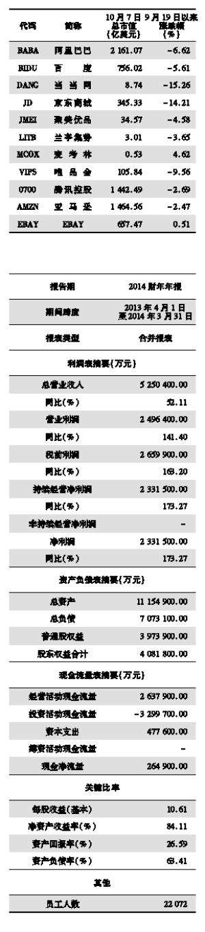 (专题数据由证券时报中心数据库提供) 在美上市后,阿里股价今后走势成为投资者热议的话题。阿里上市首日大涨38%,表现可谓惊艳,之后股价小幅回调,因此有投资者戏谑阿里是美版中石油,与此同时,也有投资者对阿里寄予厚望,认为阿里或像腾讯一样,上市是股价飙升的起点。阿里上市受热捧,为各路资本带来一场饕餮盛宴。对于阿里股价,上市是起点还是拐点?我们试图通过一张图为您解读阿里背后的故事。 本版导读: