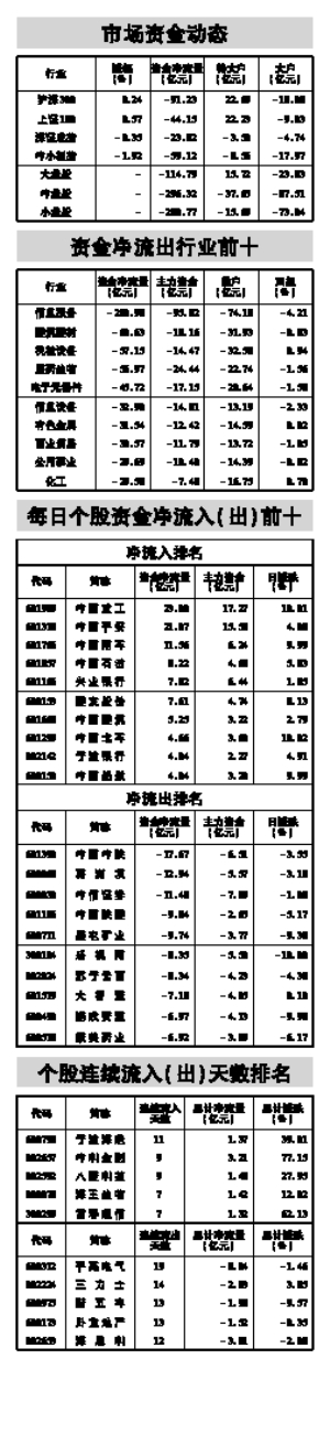 资金策市 Money Flow 各类资金当日净流量对比 据STCN资金流向快报(http://data.stcn.com/statisticalData.shtml)数据显示,3月26日,沪深两市共流出资金691.88亿元,连续第4个交易日净流出。其中,沪市净流出220.25亿元,深市净流出471.63亿元。主力资金合计流出222.00亿元。 指数方面,上证180指数成份股合计资金流出44.15亿元,深证成指成份股资金流出23.82亿元,沪深300指数成份股资金流出91.23亿元。以股本规模计,流通盘中大盘股资金流出114.79亿元,中盘股资金流出296.32亿元,小盘股资金流出280.77亿元。 行业方面,按照衍生申万一级行业分类计,有4个行业资金净流入,21个行业资金净流出。其中,保险流入资金16.26亿,成为资金最关注的行业;信息服务流出资金200.98亿,有较明显的资金出逃现象。 交运设备业已持续2个交易日净流入资金,共流入资金19.84亿,居行业连续流入天数榜首位。综合业已持续8个交易日净流出资金,共流出资金47.68亿,为行业连续流出天数榜第一。 宁波海运已持续11个交易日净流入资金,累计流入资金1.37亿,居个股连续流入天数榜首位。平高电气已持续19个交易日净流出资金,累计流出资金8.04亿,为个股连续流出天数榜第一。 股指期货方面,IF1504合约收报3934点,下跌0.46%;成交160.43万手,持仓量减734手,收报13.62万手。(陈文彬) 自3月11日起A股牛气冲天,大盘罕见“十连涨”,市场更是迎来成交额创历史纪录、创业板刷新历史新高、新增A股账户数突破百万大关。然而,随着指数的不断创新高,市场分歧加大,经过3个交易日的震荡回调,昨日大盘止跌回升。 证券时报数据中心统计,3月11日以来上证指数涨12%,贡献了今年以来近9成的涨幅,一些个股表现更是精彩纷呈。我们通过一组图表数据,为大家呈现最近一段时间哪类股最疯狂。 (专题数据由证券时报中心数据库提供) 本版导读: