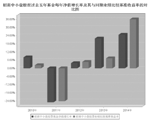 §2 基金简介 2.1 基金基本情况 ■ 2.2 基金产品说明 ■ 2.3 基金管理人和基金托管人 ■ 2.4 信息披露方式 ■ §3 主要财务指标、基金净值表现及利润分配情况 3.1 主要会计数据和财务指标 金额单位:人民币元 ■ 注:1、基金业绩指标不包括持有人认(申)购或交易基金的各项费用,计入费用后实际收益水平要低于所列数字; 2、本期已实现收益指基金本期利息收入、投资收益、其他收入(不含公允价值变动收益)扣除相关费用后的余额,本期利润为本期已实现收益加上本期公允价值变动收益; 3、期末可供分配利润,采用期末资产负债表中未分配利润与未分配利润中已实现部分的孰低数; 3.2 基金净值表现 3.2.1 基金份额净值增长率及其与同期业绩比较基准收益率的比较 ■ 注:业绩比较基准收益率=40%×天相中盘指数收益率+40%×天相小盘指数收益率+ 20%×中信标普全债指数收益率,业绩比较基准在每个交易日实现再平衡。 3.2.2 自基金合同生效以来基金份额累计净值增长率变动及其与同期业绩比较基准收益率变动的比较 ■ 注:根据基金合同第十一条(二)投资范围的规定,本基金将基金资产的60%-95%投资于股票等权益类资产(其中,权证投资比例不超过基金资产净值的3%),将基金资产的5%-40%投资于债券和现金等固定收益类品种(其中,现金或到期日在一年以内的政府债券不低于基金资产净值的5%)。本基金于2009年12月25日成立,自基金成立日起6个月内为建仓期,建仓期结束时相关比例均符合上述规定的要求。 3.2.3 过去五年基金每年净值增长率及其与同期业绩比较基准收益率的比较 ■ 3.3 过去三年基金的利润分配情况 本基金过去三年未进行利润分配。 §4 管理人报告 4.1 基金管理人及基金经理情况 4.1.1 基金管理人及其管理基金的经验 招商基金管理有限公司于2002年12月27日经中国证监会(2002)100号文批准设立,公司的经营范围包括发起设立基金、基金管理业务和中国证监会批准的其它业务。 目前,本公司的股东股权结构为:招商银行股份有限公司持有公司全部股权的55%,招商证券股份有限公司持有公司全部股权的45%。公司注册资本金为2.1亿元人民币。招商基金拥有两家全资子公司,分别为招商财富资产管理有限公司和招商资产管理(香港)有限公司。 截至2014年12月31日,本基金管理人共管理四十四只共同基金,具体如下:从2003年4月28日起管理招商安泰系列开放式证券投资基金(含招商安泰股票证券投资基金、招商安泰平衡型证券投资基金、招商安泰债券投资基金);从2004年1月14日起管理招商现金增值开放式证券投资基金;从2004年6月1日起开始管理招商先锋混合型证券投资基金;从2005年11月17日起开始管理招商优质成长股票型证券投资基金(LOF);从2006年7月11日起开始管理招商安本增利债券型证券投资基金;从2007年3月30日起开始管理招商核心价值混合型证券投资基金;从2008年6月19日起开始管理招商大盘蓝筹股票型证券投资基金;从2008年10月22日起开始管理招商安心收益债券型证券投资基金;从2009年6月19日起开始管理招商行业领先股票型证券投资基金;从2009年12月25日起开始管理招商中小盘精选股票型证券投资基金;从2010年3月25日起开始管理招商全球资源股票型证券投资基金(QDII);从2010年6月22日起开始管理招商深证100指数证券投资基金;从2010年6月25日起开始管理招商信用添利债券型证券投资基金;从2010年12月8日开始管理上证消费80交易型开放式指数证券投资基金及招商上证消费80交易型开放式指数证券投资基金联接基金;从2011年2月11日起开始管理招商标普金砖四国指数证券投资基金(LOF);从2011年3月17日起开始管理招商安瑞进取债券型证券投资基金;从2011年6月27日开始管理深证电子信息传媒产业(TMT)50交易型开放式指数证券投资基金及招商深证电子信息传媒产业(TMT)50交易型开放式指数证券投资基金联接基金;从2011年9月1日起开始管理招商安达保本混合型证券投资基金;从2012年2月1日起开始管理招商优势企业灵活配置混合型证券投资基金;从2012年3月21日起开始管理招商产业债券型证券投资基金;从2012年6月28日起开始管理招商中证大宗商品股票指数分级证券投资基金;从2012年7月20日起开始管理招商信用增强债券型证券投资基金;从2012年8月20日起开始管理招商安盈保本混合型证券投资基金;从2012年12月7日起开始管理招商理财7天债券型证券投资基金;从2013年2月5日起开始管理招商央视财经50指数证券投资基金;从2013年3月1日起开始管理招商双债增强分级债券型证券投资基金;从2013年4月19日起开始管理招商安润保本混合型证券投资基金;从2013年5月17日起开始管理招商保证金快线货币市场基金;从2013年8月1日起开始管理招商沪深300高贝塔指数分级证券投资基金;从2013年11月6日起开始管理招商瑞丰灵活配置混合型发起式证券投资基金;从2013年12月11日起开始管理招商标普高收益红利贵族指数增强型证券投资基金;从2014年3月20日开始管理招商丰盛稳定增长灵活配置混合型证券投资基金;从2014年3月25日开始管理招商招财宝货币市场证券投资基金(2014年11月22日更名为招商招钱宝货币市场基金);从2014年6月18日开始管理招商招金宝货币市场证券投资基金;从2014年7月31日开始管理招商可转债分级债券型证券投资基金;从2014年8月12日开始管理招商丰利灵活配置混合型证券投资基金; 从2014年9月3日开始管