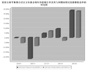 基金管理人:招商基金管理有限公司 基金托管人:招商银行股份有限公司 送出日期:2015年3月27日 §1 重要提示 基金管理人的董事会、董事保证本报告所载资料不存在虚假记载、误导性陈述或重大遗漏,并对其内容的真实性、准确性和完整性承担个别及连带的法律责任。本年度报告已经三分之二以上独立董事签字同意,并由董事长签发。 基金托管人招商银行股份有限公司根据本基金合同规定,于2015年3月24日复核了本报告中的财务指标、净值表现、利润分配情况、财务会计报告、投资组合报告等内容,保证复核内容不存在虚假记载、误导性陈述或者重大遗漏。 基金管理人承诺以诚实信用、勤勉尽责的原则管理和运用基金资产,但不保证基金一定盈利。 基金的过往业绩并不代表其未来表现。投资有风险,投资者在作出投资决策前应仔细阅读本基金的招募说明书及其更新。 本年度报告摘要摘自年度报告正文,投资者欲了解详细内容,应阅读年度报告正文。 本报告财务资料已经审计,德勤华永会计师事务所(特殊普通合伙)为本基金出具了2014年度无保留意见的审计报告,请投资者注意阅读。 本报告期自2014年1月1日起至12月31日止。 §2 基金简介 2.1 基金基本情况 ■ 2.2 基金产品说明 ■ 2.3 基金管理人和基金托管人 ■ 2.4 信息披露方式 ■ §3 主要财务指标、基金净值表现及利润分配情况 3.1 主要会计数据和财务指标 金额单位:人民币元 ■ 注:1、所述基金业绩指标不包括持有人认购或交易基金的各项费用,计入费用后实际收益水平要低于所列数字; 2、本期已实现收益指基金本期利息收入、投资收益、其他收入(不含公允价值变动收益)扣除相关费用后的余额,本期利润为本期已实现收益加上本期公允价值变动收益; 3、期末可供分配利润,采用期末资产负债表中未分配利润与未分配利润中已实现部分的孰低数。 3.2 基金净值表现 3.2.1 基金份额净值增长率及其与同期业绩比较基准收益率的比较 ■ 注:业绩比较基准收益率=45%×上证180指数收益率+50%×中信标普国债指数收益率+5%×同业存款利率,业绩比较基准在每个交易日实现再平衡。 3.2.2 自基金合同生效以来基金份额累计净值增长率变动及其与同期业绩比较基准收益率变动的比较 ■ 注:招商安泰平衡混合的债券/股票配置范围为:债券40%-60%,股票35%-55%。根据本系列基金合同规定,本基金设立后,投资建仓期为三个月,特殊情况下不超过六个月。本基金于2003年4月28日成立,建仓期结束时相关比例均符合上述规定的要求。 3.2.3 过去五年基金每年净值增长率及其与同期业绩比较基准收益率的比较 ■ 3.3 过去三年基金的利润分配情况 单位:人民币元 ■ 注:本基金于2014年1月20日以2013年12月31日为收益分配基准日进行了2013年度利润分配,利润分配登记日为2014年1月20日,每份基金份额分0.0540元,分红金额为5,045,206.98元,符合相关法律法规的有关规定以及基金合同、招募说明书的有关约定。 §4 管理人报告 4.1 基金管理人及基金经理情况 4.1.1 基金管理人及其管理基金的经验 招商基金管理有限公司于2002年12月27日经中国证监会(2002)100号文批准设立,公司的经营范围包括发起设立基金、基金管理业务和中国证监会批准的其它业务。 目前,本公司的股东股权结构为:招商银行股份有限公司持有公司全部股权的55%,招商证券股份有限公司持有公司全部股权的45%。公司注册资本金为2.1亿元人民币。招商基金拥有两家全资子公司,分别为招商财富资产管理有限公司和招商资产管理(香港)有限公司。 截至2014年12月31日,本基金管理人共管理四十四只共同基金,具体如下:从2003年4月28日起管理招商安泰系列开放式证券投资基金(含招商安泰股票证券投资基金、招商安泰平衡型证券投资基金、招商安泰债券投资基金);从2004年1月14日起管理招商现金增值开放式证券投资基金;从2004年6月1日起开始管理招商先锋混合型证券投资基金;从2005年11月17日起开始管理招商优质成长股票型证券投资基金(LOF);从2006年7月11日起开始管理招商安本增利债券型证券投资基金;从2007年3月30日起开始管理招商核心价值混合型证券投资基金;从2008年6月19日起开始管理招商大盘蓝筹股票型证券投资基金;从2008年10月22日起开始管理招商安心收益债券型证券投资基金;从2009年6月19日起开始管理招商行业领先股票型证券投资基金;从2009年12月25日起开始管理招商中小盘精选股票型证券投资基金;从2010年3月25日起开始管理招商全球资源股票型证券投资基金(QDII);从2010年6月22日起开始管理招商深证100指数证券投资基金;从2010年6月25日起开始管理招商信用添利债券型证券投资基金;从2010年12月8日开始管理上证消费80交易型开放式指数证券投资基金及招商上证消费80交易型开放式指数证券投资基金联接基金;从2011年2月11日起开始管理招商标普金砖四国指数证券投资基金(LOF);从2011年3月17日起开始管理招商安瑞进取债券型证券投资基金;从2011年6月27日开始管理深证电子信息传媒产业(TMT)50交易型开放式指数证券投资基金及招商深证电子信息传媒产业(TMT)50交易型开放式指数证券投资基金联接基金;从2011年9月1日起开始管理招商安达保本混合型证券投资基金;从2012年2月1日起开始管理招商优势企业灵活配置混合型证券投资基金;从2012年3月21日起开始管理招商产业债券型证券投资基金;从201