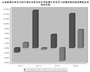 基金管理人:万家基金管理有限公司 基金托管人:中国邮政储蓄银行股份有限公司 送出日期:2015年3月27日 §1 重要提示 基金管理人的董事会、董事保证本报告所载资料不存在虚假记载、误导性陈述或重大遗漏,并对其内容的真实性、准确性和完整性承担个别及连带的法律责任。本年度报告已经三分之二以上独立董事签字同意,并由董事长签发。 基金托管人中国邮政储蓄银行股份有限公司根据本基金合同规定,于2015年3月25日复核了本报告中的财务指标、净值表现、利润分配情况、财务会计报告、投资组合报告等内容,保证复核内容不存在虚假记载、误导性陈述或者重大遗漏。 基金管理人承诺以诚实信用、勤勉尽责的原则管理和运用基金资产,但不保证基金一定盈利。 基金的过往业绩并不代表其未来表现。投资有风险,投资者在作出投资决策前应仔细阅读本基金的招募说明书及其更新。 本年度报告摘要摘自年度报告正文,投资者欲了解详细内容,应阅读年度报告正文。 本报告财务资料已经审计。安永华明会计师事务所为本基金出具了无保留意见的审计报告,请投资者注意阅读。 本报告期自2014年1月1日起至12月31日止。 §2 基金简介 2.1 基金基本情况 ■ 2.2 基金产品说明 ■ 2.3 基金管理人和基金托管人 ■ 2.4 信息披露方式 ■ §3 主要财务指标、基金净值表现及利润分配情况 3.1 主要会计数据和财务指标 金额单位:人民币元 ■ 注:(1)本期已实现收益指基金本期利息收入、投资收益、其他收入(不含公允价值变动收益)扣除相关费用后的余额,本期利润为本期已实现收益加上本期公允价值变动收益; (2)所述基金业绩指标不包括持有人认购或交易基金的各项费用,计入费用后实际收益水平要低于所列数字; (3)期末可供分配利润采用期末资产负债表中未分配利润与未分配利润中已实现部分的孰低数。 3.2 基金净值表现 3.2.1 基金份额净值增长率及其与同期业绩比较基准收益率的比较 ■ 3.2.2 自基金合同生效以来基金份额累计净值增长率变动及其与同期业绩比较基准收益率变动的比较 ■ 注:本基金于2011年6月2日成立,根据基金合同规定,基金合同生效后六个月内为建仓期。建仓期结束时各项资产配置比例符合基金合同要求,报告期末各项资产配置比例符合基金合同要求。 3.2.3 自基金合同生效以来基金每年净值增长率及其与同期业绩比较基准收益率的比较 ■ 注:本基金于2011年6月2日成立,合同生效当年按实际存续期计算,不按整个自然年度进行折算。 3.3 过去三年基金的利润分配情况 单位:人民币元 ■ §4 管理人报告 4.1 基金管理人及基金经理情况 4.1.1 基金管理人及其管理基金的经验 万家基金管理有限公司经中国证监会证监基金字[2002]44号文批准设立。公司现股东为齐鲁证券有限公司、新疆国际实业股份有限公司和山东省国有资产投资控股有限公司, 住所地及办公地点均为上海市浦东新区浦电路360号陆家嘴投资大厦9楼,注册资本1亿元人民币。目前管理十八只基金,分别为万家180指数证券投资基金、万家增强收益债券型证券投资基金、万家行业优选股票型证券投资基金、万家货币市场证券投资基金、万家和谐增长混合型证券投资基金、万家双引擎灵活配置混合型证券投资基金、万家精选股票型证券投资基金、万家稳健增利债券型证券投资基金、万家中证红利指数型证券投资基金、万家添利分级债券型证券投资基金、万家中证创业成长指数分级证券投资基金、万家信用恒利债券型证券投资基金、万家日日薪货币市场证券投资基金、万家岁得利定期开放债券型发起式证券投资基金、万家强化收益定期开放债券型证券投资基金、万家上证380交易型开放式指数证券投资基金、万家城市建设主题纯债债券型证券投资基金和万家现金宝货币市场证券投资基金。 4.1.2 基金经理(或基金经理小组)及基金经理助理简介 ■ 4.2 管理人对报告期内本基金运作遵规守信情况的说明 本报告期内,本基金管理人严格遵守基金合同、《证券投资基金法》、《证券投资基金运作管理办法》等法律、法规和监管部门的相关规定,依照诚实信用、勤勉尽责、安全高效的原则管理和运用基金资产,在认真控制投资风险的基础上,为基金持有人谋取最大利益,没有损害基金持有人利益的行为。 4.3 管理人对报告期内公平交易情况的专项说明 4.3.1 公平交易制度和控制方法 根据中国证监会颁布的《证券投资基金管理公司公平交易制度指导意见》,公司制定了《万家基金管理有限公司公平交易管理办法》,涵盖了研究、授权、投资决策和交易执行等投资管理活动的各个环节,严禁直接或通过第三方的交易安排在不同投资组合之间进行利益输送,确保公平对待不同投资组合。 在投资决策上:(1)公司对不同类别的投资组合分别设定独立的投资部门,公募基金经理和特定客户资产管理投资经理不得互相兼任。(2)公司投资管理实行分层次决策,投资决策委员会下设的公募基金投资决策小组和专户投资决策小组分别根据公募基金和专户投资组合的规模、风格特征等因素合理确定各投资组合经理的投资权限,投资组合经理在授权范围内自主决策,超过投资权限的操作需经过严格的逐级审批程序。(3)公司接受的外部研究报告、研究员撰写的研究报告等均通过统一的投研管理平台发布,确保各投资