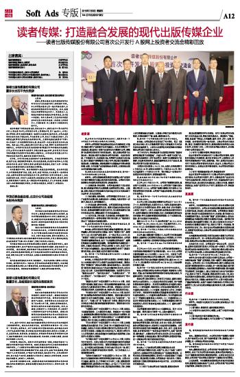 读者出版传媒股份有限公司 副董事长、总经理彭长城先生致结束词 尊敬的各位投资者、各位网友: 大家好! 读者出版传媒股份有限公司首次公开发行股票网上路演已近尾声,感谢各位投资者朋友的积极参与和交流,相信各位对读者传媒的产品服务、经营管理以及未来发展已经有了更加深入的了解。感谢大家的积极参与,你们的支持和关注让我们受益匪浅。同时,也感谢上证路演中心、中国证券网-网上路演中心所提供的交流平台和良好服务,感谢主承销商华龙证券股份有限公司以及所有参与本次发行的中介机构的鼎力支持,感谢你们付出的辛勤劳动。 今天,我们十分荣幸,读者出版传媒股份有限公司的首次公开发行股票网上路演顺利举行。通过此次沟通与交流,我们深深体会到作为一家上市公司--责任重大、使命艰巨。对于大家提出的宝贵意见和建议,我们将在今后的工作中认真汲取和借鉴,努力创造出更好的业绩来回报大家的关心与厚爱。今后,在监管机构、保荐机构、各位投资者、新闻媒体等社会各界的帮助和支持下,读者传媒将按照上市公司要求规范运营,开拓创新,不断做大做强,成为投资者信赖的上市公司。 时间有限,沟通无限。虽然今天的交流即将告一段落,但读者传媒与广大投资者的沟通和交流才刚刚开始,欢迎大家通过各种方式与我们保持密切的沟通和联系。广大投资者的支持将是读者传媒发展的最重要动力。 读者传媒高管团队将继续秉承“开放、发展、合作、共赢”的发展理念,带领“读者”人不断开拓进取,以“读者”品牌为依托,通过资本平台,不断加强对外合作,努力完善产业布局,持续提升公司竞争力,创造更大的价值空间,以此回报各位投资者,回报员工,回报社会。 在本次网上路演结束之际,我谨代表读者出版传媒股份有限公司再次感谢各位网友的热情参与,感谢各位投资者朋友对公司的关心、信任和支持!谢谢大家! 本版导读: