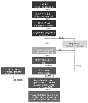 发行人声明 光明乳业股份有限公司(以下称“公司”)及全体董事承诺:本次非公开发行股票预案不存在虚假记载、误导性陈述或重大遗漏,对非公开发行股票预案的真实性、准确性、完整性承担个别和连带的法律责任。 本预案是公司董事会对本次非公开发行股票的说明,中国证券监督管理委员会及其他政府部门对本次非公开发行股票所做的任何决定或意见,均不表明其对本发行人股票的价值或投资者的收益作出实质性判断或保证。 本预案所述本次非公开发行股票相关事项的生效和完成尚待取得有关审批机关的批准或核准。 本预案是公司董事会对本次非公开发行股票的说明,任何与之相反的声明均属虚假不实陈述。 本次非公开发行股票完成后,公司经营与收益的变化,由公司自行负责;因本次非公开发行股票引致的投资风险,由投资者自行负责。投资者如有任何疑问,应咨询自己的股票经纪人、律师、专业会计师或其他专业顾问。 重要提示 1、光明乳业股份有限公司本次非公开发行股票相关事项已经公司第五届董事会第三十二次会议、第五届董事会第三十五次会议审议通过,尚需获得公司股东大会批准,以及上海市国资委批准、商务部原则批复和中国证监会核准。 2、本次发行方案涉及的境外收购项目已经公司第五届董事会第三十二次会议、第五届董事会第三十五次会议审议通过,尚需获得公司股东大会批准,以及中国相关发改部门、商务部门、外汇管理部门等相关部门的批准、许可或备案登记,并需办理境外相关政府机构的相应程序。 3、公司本次非公开发行股票的发行对象为深圳市信晟投资合伙企业(有限合伙)、晟创投资有限公司、上海益民食品一厂(集团)有限公司、上海汽车集团股权投资有限公司、上海国盛集团投资有限公司和上海浦科源富达壹投资合伙企业(有限合伙)。 4、本次非公开发行股票的定价基准日为公司第五届董事会第三十二次会议决议公告日(即2015年6月9日)。本次发行定价基准日前20个交易日(不含定价基准日)公司股票交易均价的90%为16.38元/股。2015年5月26日,公司根据2014年度利润分配方案向全体股东每股派现金红利0.28元(含税),公司本次发行的股票价格相应调整为16.10元/股。 定价基准日前20个交易日股票交易均价=定价基准日前20个交易日股票交易总额/定价基准日前20个交易日股票交易总量。 若公司股票在定价基准日至发行日期间有派息、送股、资本公积金转增股本等除权除息事项,公司将按规定对发行价格进行相应调整。 5、本次非公开发行股票的数量不超过559,006,208股(含559,006,208股),在该范围内,董事会提请股东大会授权董事会根据实际情况与保荐机构(主承销商)协商确定最终发行数量。若公司股票在定价基准日至发行日期间有派息、送股、资本公积金转增股本等除权除息事项,则本次发行数量将做相应调整。 6、本次非公开发行的股票自本次发行结束之日起三十六个月内不得转让。 7、本次非公开发行募集资金总额不超过90亿元(含发行费用),扣除发行费用后计划投资于以下项目: ■ 注:根据《股权转让最终协议》的约定,本次标的股权转让的转让对价应以欧元计价和支付,按照评估基准日的汇率进行折算。 根据评估机构上海财瑞资产评估有限公司出具的沪财瑞评报(2015)第2044号评估报告,Bright Food Singapore Investment Pte. Ltd.在评估基准日2015年3月31日股东全部权益评估值为人民币657,075.10万元(折合新谢克尔421,310.00万元)。上述评估报告已经上海市国有资产监督管理委员会备案通过。 若本次非公开发行实际募集资金净额少于上述项目拟投入募集资金金额,公司将根据实际募集资金净额,按照轻重缓急的顺序投入各募集资金投资项目,不足部分由公司通过自筹资金或者其他方式解决。根据《股权转让最终协议》的约定,本次标的股权转让的转让对价应以欧元计价和支付,若因汇率变动等客观因素使得上述收购标的股权项目的实际投入募集资金额低于上述计划使用募集资金额时,差额部分将用于补充流动资金。本次发行募集资金到位之前,公司可根据项目进展情况以自筹资金先行投入,并在募集资金到位之后予以置换。 8、本预案已在“第五节 公司利润分配政策的执行情况”中对公司利润分配政策、最近三年现金分红等情况进行了披露,请投资者予以关注。 释 义 在本预案中,除非另有说明,下列简称具有如下涵义: ■ 本预案中部分合计数与各数值直接相加之和在尾数上存在差异,是由于数字四舍五入造成。 第一节 非公开发行股票方案概要 一、光明乳业基本情况 ■ 光明乳业所处行业为乳制品行业,公司主要从事乳制品的开发、生产和销售。自成立以来,公司一直坚持以乳品为主的产业链一体化发展模式,通过细分市场和渠道延伸促进公司在全国的发展。公司建立了完善的产业结构,拥有世界一流的乳品研发中心、乳品加工设备以及先进的乳品加工工艺,形成了保鲜奶、酸奶、超高温灭菌奶、奶粉等系列产品,是国内领先的乳制品生产、销售企业之一。 二、本次非公开发行的背景和目的 (一)本次非公开发行的背景 近年来,随着我国国民经济的不断发展,人民生活水平日益提高,家庭的膳食结构得到普遍改善,对乳制品的消费量呈明显上升趋势。乳制品已成为继粮食、肉类、水产之后的人民生活必须的食品。虽然