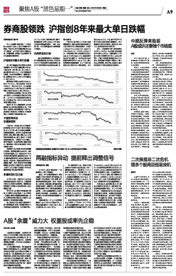 证券时报记者 赖少华 昨日,A股遭遇“黑色星期一”,沪指大跌8.48%失守3800点,创8年来最大单日跌幅。个股方面,两市再现跌停潮,超1800只个股跌停,占可交易个股的比例超过8成。权重股领跌,券商股几近全线跌停,成为大盘重挫的重要推手。 沪指创8年最大单日跌幅 受上周五尾盘跳水及外围股市大跌等因素影响,昨日沪指开盘跳空跌开逾2%。开盘后沪指一度小幅上扬,站上4000点,盘中最高报4051.16点。不过市场整体仍处弱势,此后沪指持续跳水,尾盘加速下跌,连续跌破3900点、3800点两大整数关口,逼近3700点。 截至收盘,沪指跌8.48%报3725.56点,成交7213亿元;深证成指跌7.59%报12493.0点,成交6677亿元;中小板指跌7.76%报8370.61点,成交2687亿元;创业板指跌7.40%报2683.45点,成交1698亿元。 股指期货亦全线重挫,中证500、沪深300期指主力合约尾盘双双跳水封死跌停,上证50主力合约触及跌停后稍有反弹,不过仍跌近9%。两大主力合约目前均呈现大幅贴水状态。 港股方面,受A股暴跌影响,恒生指数跌逾3%,恒生国企指数跌近4%。中国银河、中船防务、重庆钢铁股份、中国中冶、复星医药、海通证券、中海集运、中海发展股份、大连港等个股跌幅均超10%。 千股跌停再现 权重股领跌 个股方面,两市超1800只个股跌停,跌停家数占当天可交易个股的比例超8成,仅77只个股上涨。行业板块全线飘绿,权重股跌幅居前,成为昨日大盘大跌的重要推手。券商、煤炭、保险、钢铁、电力、有色等板块跌幅超9%,银行、房地产、石油等板块跌幅超8%。“两桶油”午后开盘虽一度有护盘动作,不过收效甚微,尾盘双双跳水。截至收盘,中国石化逼近跌停,中国石油重挫9.58%。 券商股昨日全天走弱,成为两市跌幅最大的板块,除国海证券跌9.87%以外,其余22股均封死跌停。近日,证监会公布了2015年券商分类评级结果,虽然券商在过去一年中,整体风控管理向好,但仍有长城证券、华福证券、华西证券、民族证券和平安证券5家遭遇“降级”。此外,券商的半年报业绩都很靓丽,但在经历了前段时间的下跌和市场“去杆杠”之后,市场对于券商股下半年的业绩预期普遍下降,股价短期承压。 多重利空打压大盘 对于昨日大跌,市场分析人士认为系多重因素共振所致。外围方面,上周道指累计跌近3%,欧股亦出现普跌。美联储加息预期强烈、外围股市大跌直接导致A股大幅跳空开盘。 国内方面,IMF敦促中国退出救市措施,在市场信心未完全恢复下,IMF的举动一定程度上影响市场情绪和做多动能。此外,近期猪肉价格大幅走高,市场担心CPI数据承压,货币政策被迫调整。 就A股本身而言,前期大量停牌的个股开始陆续复牌,客观上形成新的供给,对市场资金的充裕度形成一定的考验。同时,自7月9日以来,市场持续反弹,很多个股连续涨停,反弹在50%以上的个股比比皆是抄底资金获利颇丰,市场一旦出现下跌,巨大的获利盘会对市场形成极大的抛压。 机构资金现分歧 盘后龙虎榜数据显示,机构资金在昨日依然表现活跃。统计显示,两市共有近50只个股龙虎榜中出现机构席位,逾20只个股买卖席位均出现机构身影,呈现对垒局面。 个股方面,荣之联近3个交易日龙虎榜数据显示,该股在复牌后获机构抢筹,买方前五席位中有4席是机构席位,分别买入4024.52万元、1730.09万元、1506.57万元和1459.49万元,合计买入8720.67万元。中国武夷昨日获2机构席位分别买入6482.39万元和2288.01万元,该股还获中信证券“四大金刚”之一的中信证券北京呼家楼证券营业部买入2501.47万元。新开普则遭到机构集体抛售,近3个交易日该股卖方前五席位中有4席机构席位,合计卖出8667.29万元。不过,新开普近两个交易日大部分交易时段成交量都很小,昨日尾盘集合竞价在涨停板上被卖出近9000万元,是否机构所为尚不得而知。 此外,万达院线昨日获2家机构席位合计买入1.56亿元,不过亦遭4家机构席位合计卖出2.78亿元。东源电器近3个交易日在获4机构席位合计买入1.86亿元的同时,亦遭2机构席位抛售逾8000万元。此外,机构资金在多氟多、西陇化工、勤上光电、四维图新、首航节能、东诚药业、振芯科技等多只个股均出现多空分歧局面。 本版导读: