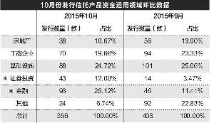 集合信托产品的发行数量依然处于下行轨道。 11月11日,普益财富发布的最新数据显示,10月份共有53家信托公司发行356款集合信托产品。这一数据与9月份相比,减少47款,降幅为11.66%。值得一提的是,投资于证券市场及金融领域的集合信托产品发行量出现回升。 成立数量资金规模双降 证券时报记者注意到,一些中型信托公司在10月份的集合信托发行市场上表现积极。 举例而言,四川信托10月份发行了32款集合信托,发行产品数量位列第一。位列第二的是长安信托,10月份累计发行24款。此外,地处杭州的万向信托及中建投信托,分别以19款及15款的集合产品发行数量名列榜单前列。 上述四家公司累计发行90款集合信托产品,占10月份发行产品数量的1/4。 如果将关注点放在集合信托产品的成立上,市场缩量的情况更为明显。 数据显示,10月份共有55家信托公司成立338款集合信托产品,环比减少188款,降幅35.74%。 上述338款集合信托产品中,公布募集规模的产品有287只,累计募集资金558.59亿元。这一数据较9月份减少176.31亿元,降幅23.99%。 证券类产品发行回暖 值得一提的是,在各领域产品发行规模下降的情况下,投资于证券市场及金融领域的集合信托产品发行量出现回升。 数据显示,10月份发行的356款产品中,投资于房地产领域的产品38款,环比减少18款;投资于工商企业领域的产品70款,环比减少24款;投资于基础设施领域的产品88款,环比减少13款;投资于其他领域的产品24款,环比减少68款。这四类产品发行占比亦同时出现下降。 与此同时,投资于证券信托类领域的产品发行43款,环比增加29款;投资于金融领域的产品93款,环比增加47款。 据记者了解,10月集合信托发行量冠军四川信托发行产品的主要投向即是证券市场。 实际上,证券投资信托产品发行量自年初以来一直维持高位,今年5月份一度达到顶峰,但受之后股市下行的影响,一度降至冰点。 而在刚刚过去的10月份,二级市场重新回暖,上证指数月度上涨10.80%,创业板指数更是大涨19.00%。 格上理财研究中心相关人士认为,目前证券投资类信托产品的发行情况或已触底,未来发行情况或会随着股市利好进一步回暖。 此外,普益财富数据显示,10月份投资于金融市场的集合信托产品的收益呈上升趋势,投向其他领域的信托产品收益则仍延续下降趋势。 本版导读: