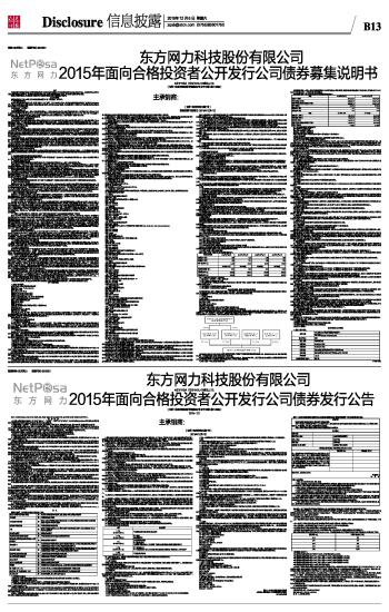 发行人及董事会全体成员保证公告内容的真实、准确和完整,对公告的虚假记载、误导性陈述或者重大遗漏负连带责任。 重 要 提 示 1、东方网力科技股份有限公司(以下简称“发行人”、“本公司”、“公司”或“东方网力”)经中国证监会[2015]2494号文核准,公司获准面向合格投资者公开发行面值总额不超过人民币3亿元的公司债券。 2、本期债券简称“15东网债”,债券代码为112302,发行规模为人民币3亿元,每张面值为100元,共计300万张,发行价格为100元/张。 3、本期债券的信用等级为AA+,发行人主体信用等级为A+。发行人截至2015年9月30日的所有者权益合计(合并报表口径)为95,461.08万元,归属于母公司所有者权益合计93,182.52万元;发行人最近三个会计年度实现的年均可分配利润为10,529.14万元,预计不少于本次债券一年利息的1.5倍。截至2015年9月30日,发行人的资产负债率为44.57%(合并报表口径),母公司的资产负债率为45.48%。 本次债券发行及挂牌上市安排请参见发行公告。发行人在本次发行前的财务指标符合相关规定。 4、担保方式:本次债券由深圳市高新投集团有限公司提供无条件的不可撤销的连带责任保证担保。 5、本期债券为3年期品种,附第2年末发行人上调票面利率选择权及投资者回售选择权。 6、上调票面利率选择权:发行人有权决定在本次债券存续期间的第2年末上调本次债券后1年的票面利率,调整幅度为0至100个基点(含本数),其中1个基点为0.01%。 7、投资者回售选择权:投资者有权选择在第2个付息日将其持有的全部或部分本次债券按票面金额(回售价格:100元/张)回售给发行人,或放弃投资者回售选择权而继续持有。本次债券第2个计息年度付息日即为回售支付日,发行人将按照深交所和证券登记机构相关业务规则完成回售支付工作。 8、发行人上调票面利率和回售实施办法公告日:发行人将于本次债券第2个付息日前的第10个交易日刊登关于是否上调本次债券票面利率以及上调幅度的公告和回售实施办法公告。 9、投资者回售申报期:持有本次债券的投资者拟部分或全部行使回售选择权,可于发行人刊登关于是否上调本次债券票面利率以及上调幅度的公告和回售实施办法公告之日起3个交易日内进行回售登记,回售登记经确认后不能撤销,相应的公司债券票面总额将被冻结交易;若投资者未在回售申报期进行登记的,则视为放弃回售选择权,继续持有本次债券并接受上述调整。 10、还本付息方式:本期债券采用单利按年计息,不计复利。每年付息一次,到期一次偿还本金,最后一期利息随本金的兑付一起支付。 11、本期债券票面利率询价区间为6.00%-7.50%,票面利率由发行人和簿记管理人通过市场询价协商确定。 发行人和簿记管理人将于2015年12月8日(T-1日)向网下投资者进行利率询价,并根据询价结果确定本期债券的最终票面利率。发行人于2015年12月9日(T日)在《中国证券报》、《证券时报》、巨潮资讯网(http://www.cninfo.com.cn)及深交所网站(http://www.szse.com.cn)上公告本期债券的最终票面利率,敬请投资者关注。 12、本公司主体信用等级为A+,本期债券信用等级为AA+,本期债券不符合进行质押式回购交易的基本条件,特提示欲参与本期债券发行的投资者关注相关风险、谨慎投资。 13、本期债券发行采取网下面向符合《公司债券发行与交易管理办法》(以下简称“《管理办法》”)规定且在登记公司开立合格A股证券账户的合格投资者询价配售的方式。网下申购由簿记管理人根据簿记建档情况进行配售。具体发行安排将根据深圳证券交易所的相关规定进行。具体配售原则请详见本公告之“三、网下发行”之“(五)配售”。 14、网下发行面向在登记公司开立合格A股证券账户的合格投资者。合格投资者通过向主承销商(簿记管理人)提交《网下询价及认购申请表》的方式参与网下询价申购。合格投资者网下最低申购金额为100万元(含100万元),超过100万元的必须是100万元的整数倍。 15、投资者不得非法利用他人账户或资金进行认购,也不得违规融资或替他人违规融资认购。投资者认购并持有本期债券应遵守相关法律法规和中国证监会的有关规定,并自行承担相应的法律责任。 16、敬请投资者注意本公告中本期债券的发行方式、发行对象、发行数量、发行时间、认购办法、认购程序、认购价格和认购款缴纳等具体规定。 17、本次债券发行结束后,公司将及时向深圳证券交易所提出上市交易申请,并将申请在深圳证券交易所集中竞价系统和综合协议交易平台同时挂牌(以下简称“双边挂牌”)。但本次债券上市前,公司经营业绩、财务状况、现金流和信用评级等情况可能出现重大变化,公司无法保证本次债券双边挂牌的上市申请能够获得深圳证券交易所同意,若届时本期债券无法进行双边挂牌上市,投资者有权选择在上市前将本期债券回售予本公司。因公司经营与收益等情况变化引致的投资风险和流动性风险,由债券投资者自行承担。本期债券不能在除深圳证券交易所以外的其它交易场所上市。 18、本公告仅对本期债券发行的有关事宜进行说明,不构成针对本期债券的任何投资建议。投资者欲详细了解本期债券情况,请仔细阅读《东方网力科技股份有限公司2015年面向合格投资者公开发行公司债券募集说明书》,该募集说明书摘要已刊登在2015年12月7日的《中国证券